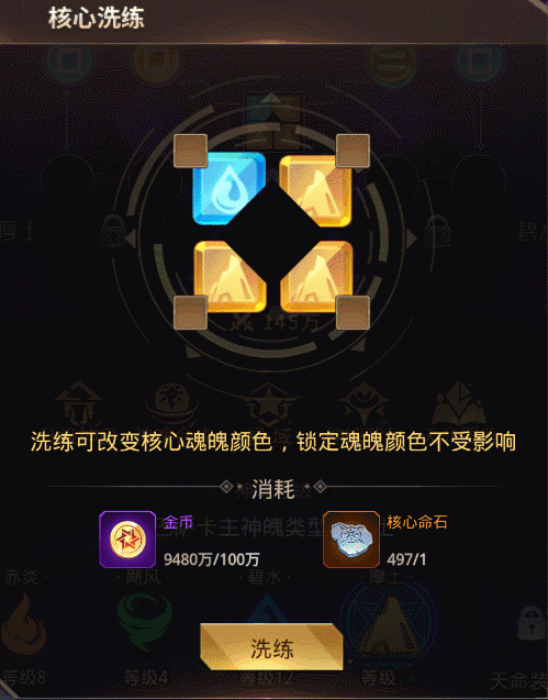 核心神魄可以使用核心命石进行洗练,洗练可改变神魄属性,当4个部分的神魄属性相同时,可以解锁纯色属性加成。