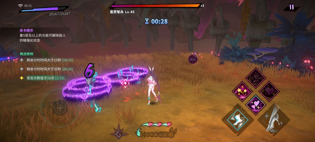 先通过释放各种除主角技(粉色小♥那个)外的技能把屏幕中间靠下方的三个小♥♥♥全点亮。然后按住主角技(粉色小♥那个)按钮不要放开,直到屏幕中间靠下方的三个小♥♥♥全耗光,至多重复2次,光能就到5层了,成功破解紫圈。
