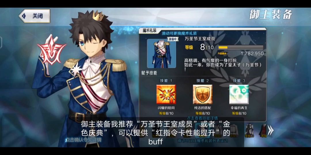 御主装备推荐“万圣节王室成员”或者“金色庆典”。