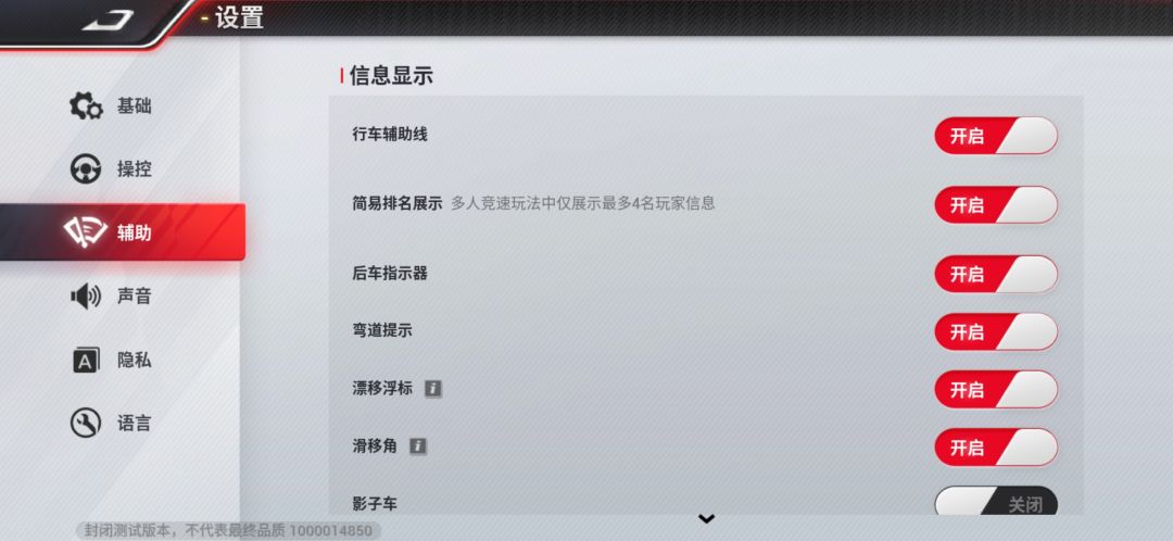 在漂移时,新手很难确定最合适自己操作风格的起漂点,此时就需要辅助标线来帮忙。因此,萌新车手可以开启「弯道提示」「漂移浮标」以及「行车辅助线」,在看到有弯道提示的时候就要做好准备,在浮标处进行漂移。等到完全熟悉车辆在漂移时的手感后,就可以关闭辅助标线进行全手操作,体验感更佳。
