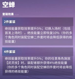 空蝉:空蝉4可以大幅度提升角色绝技能量获取效率,搭配光暗反应以及武魂姬关银屏的效果可以快速获得绝技能量,4件套效果也可以让小舞在后台时也可以恢复绝技能量,从而让小舞可以每轮都放出绝技从而增加全队绝技能量获取效率