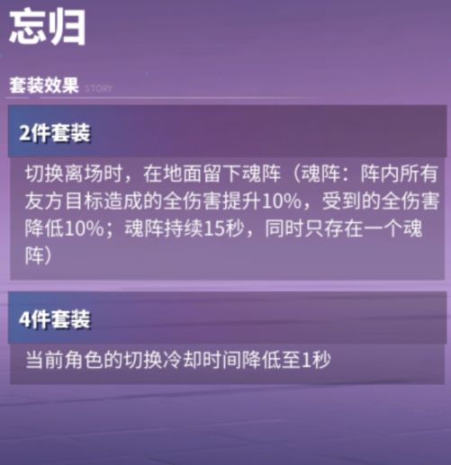 忘归:副C或辅助的通用2件套,可以在切换离场时留下一个魂阵,为主C提供伤害加成。