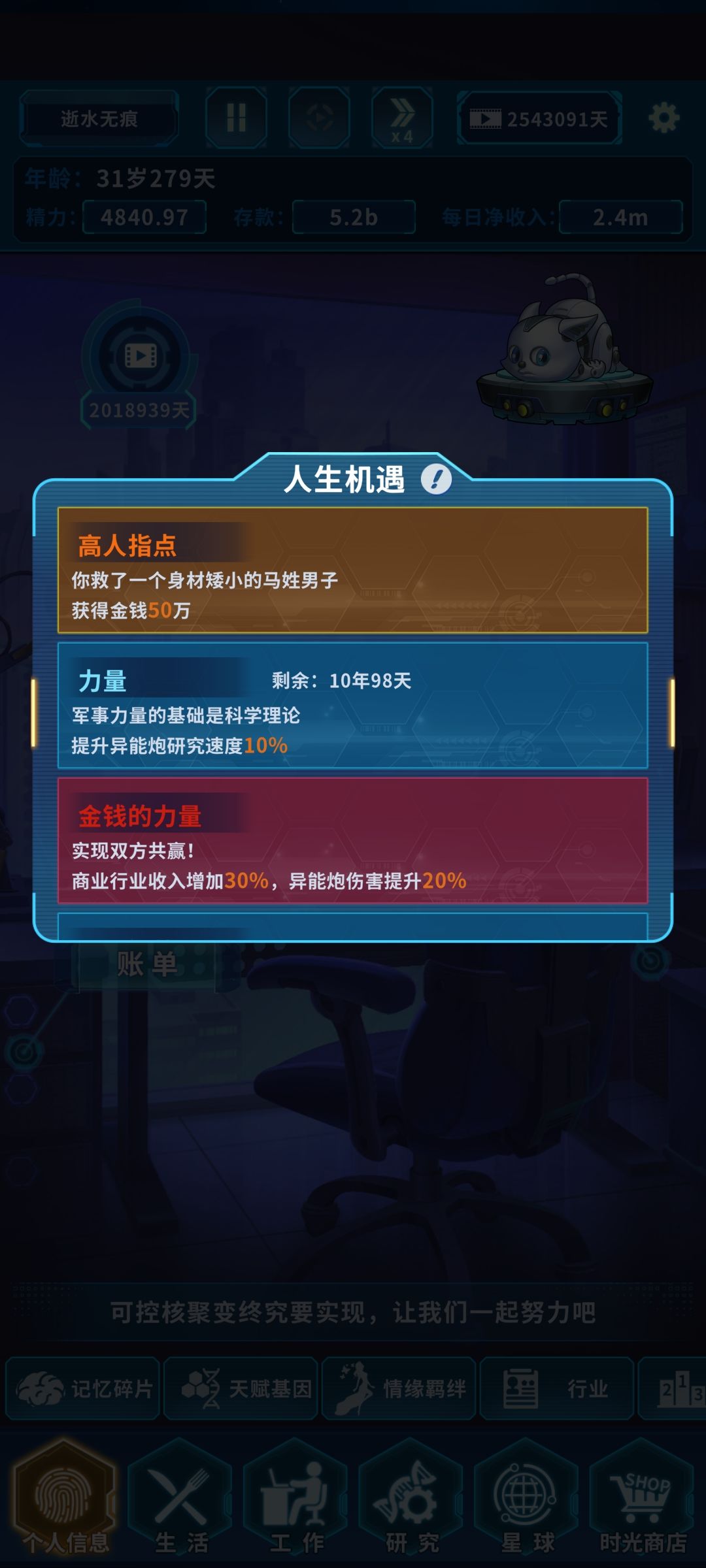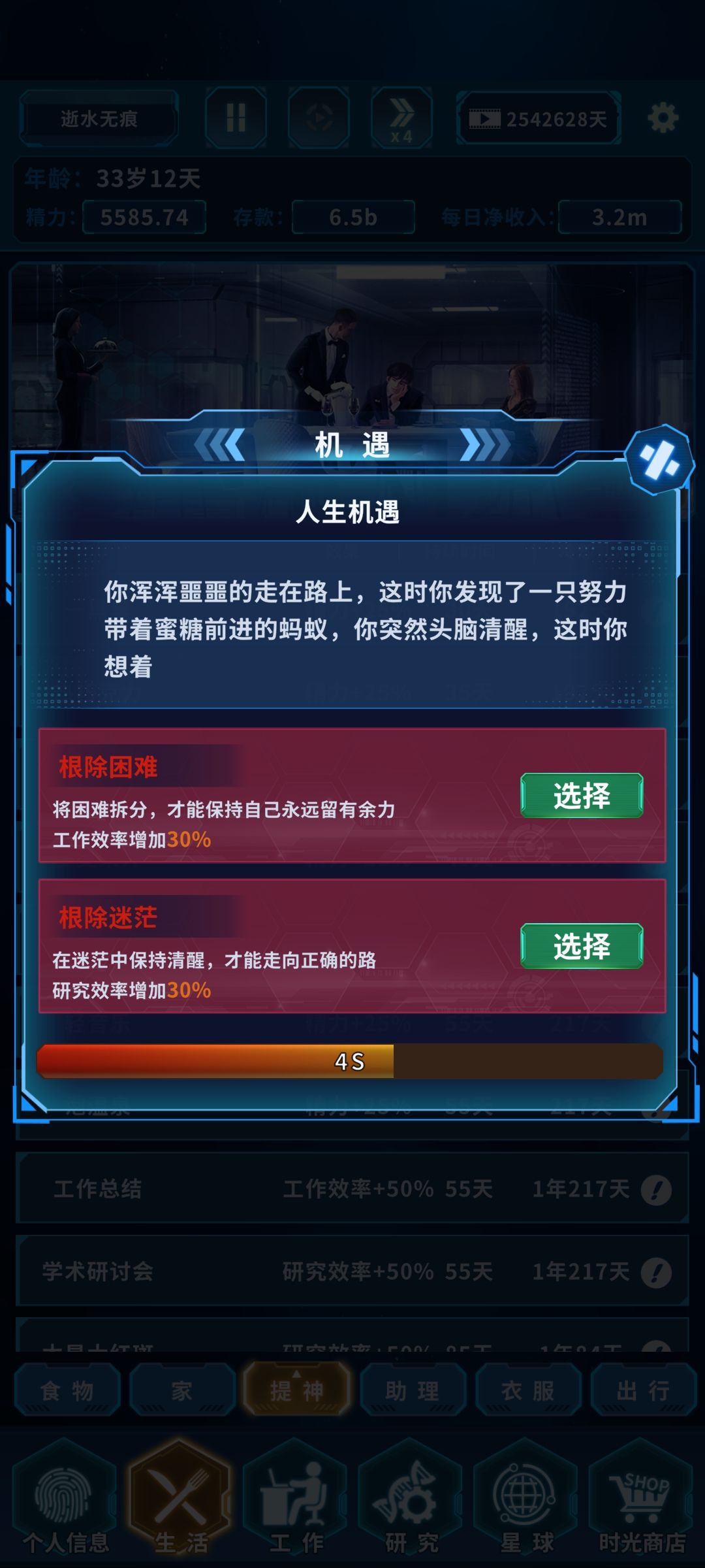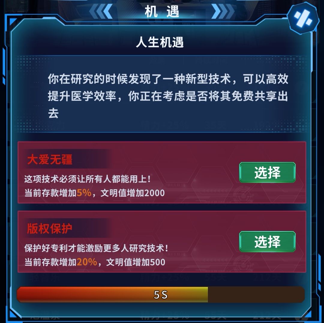 所以大家都杯具了 )!所以重要机遇+投资收入!看过上章就知道这二个组合+20%收入.强大无比.另还有一个程序员转投资+10%的前期+30%投资收入假如开局机遇也选+10%投资收入(金融大鄂)那就是40% 投资收入了......人生顶峰25岁180天:选行码艺术永久词条+10投资收入(+艺术职业)有机率出美学代码+0.3精力(永久)