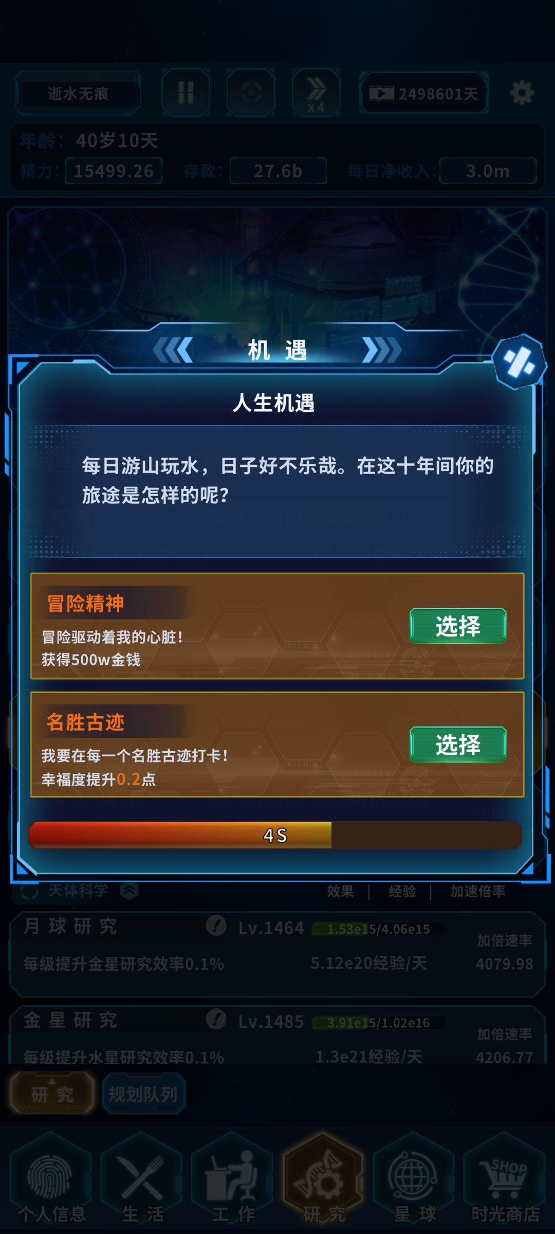 3.游山玩水(-20%存款 +0.1幸福度)→后续分二种1:冒险精神(+500w)这个搞笑加5t差不多