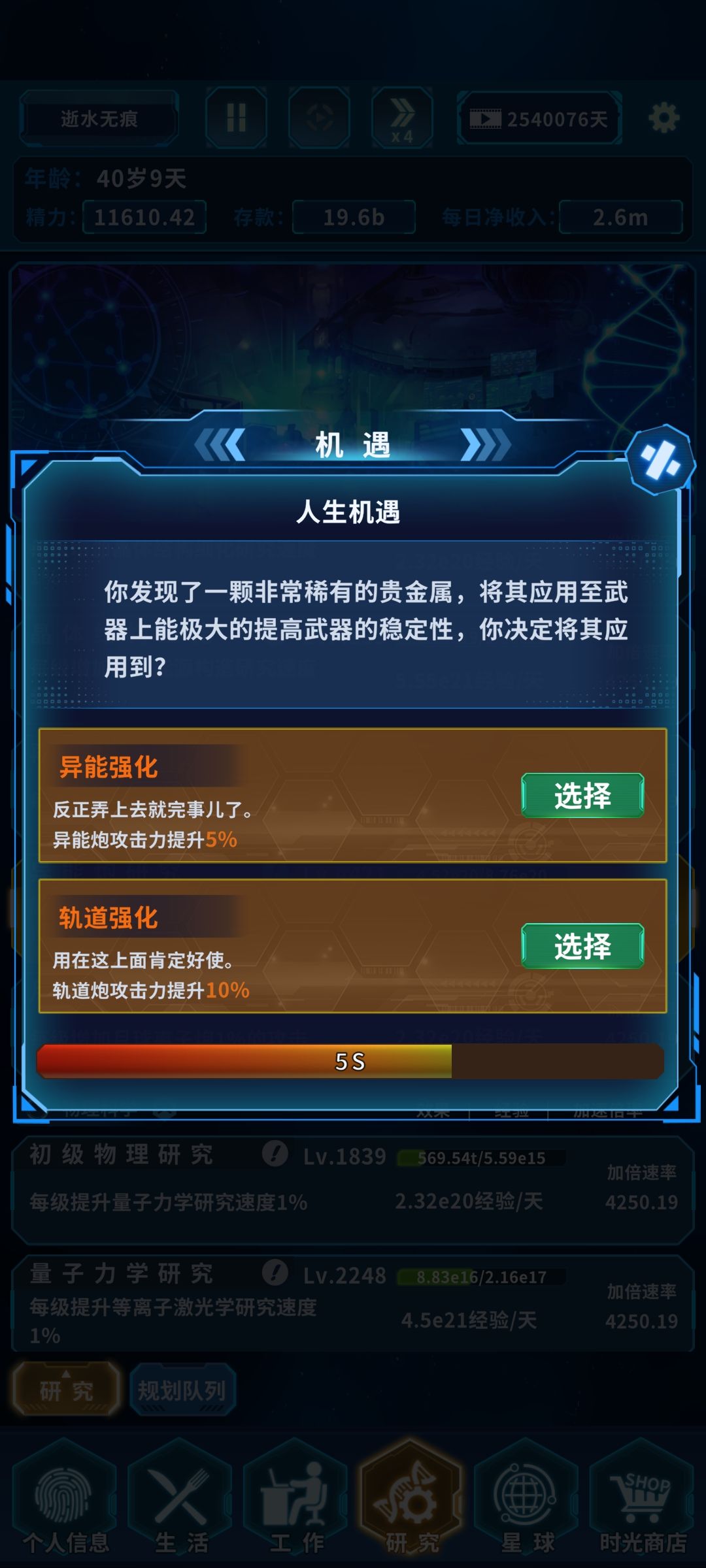 3:力量(提升异能炮+10%)这个和30岁200天出的防御强化+人工智能=核心改造(提升异能炮攻击)=红色永久词条(金钱的力量)→40岁出1.(轨道炮加强)2.(异能炮加强)