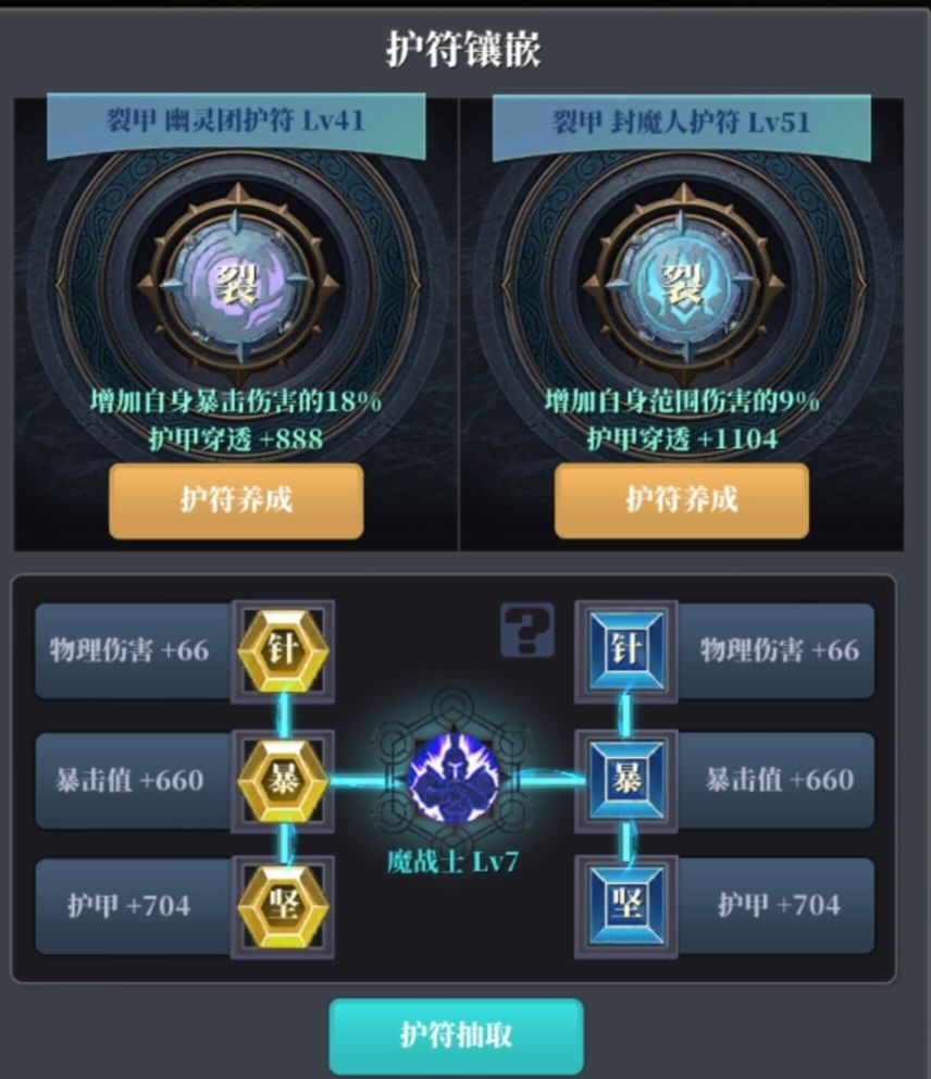 满足100%暴击值就用裂甲护符,晶片最好2坚+1强或者1针,因为泣斩是根据护甲加伤。