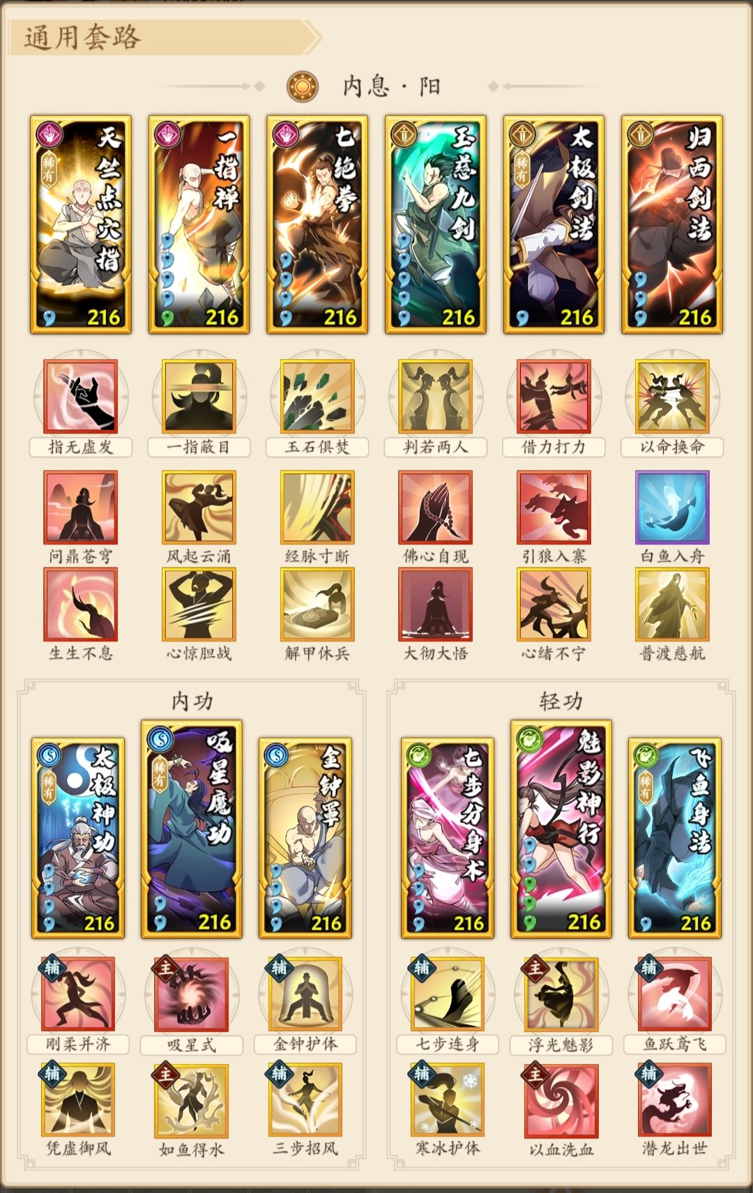 阴塔由于七绝拳跟一指禅都是阴中上不了,导致吸内效率大跌。我们得依靠剑法的聚气连击回血来凹概率,带了太极剑跟太极拳就是要他俩的高伤害