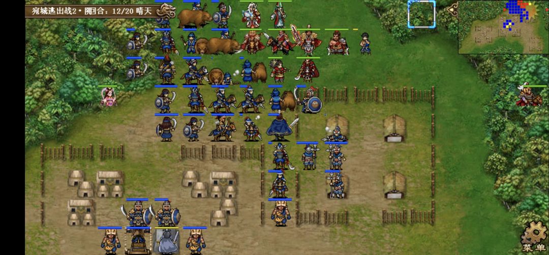 第二回合,我方援军在右上出现,大夏堵住敌主营上方出口,徐晃堵住兵营之间的路口,大部队撤退的同时在树林边缘拉起一条防线挡住追兵。