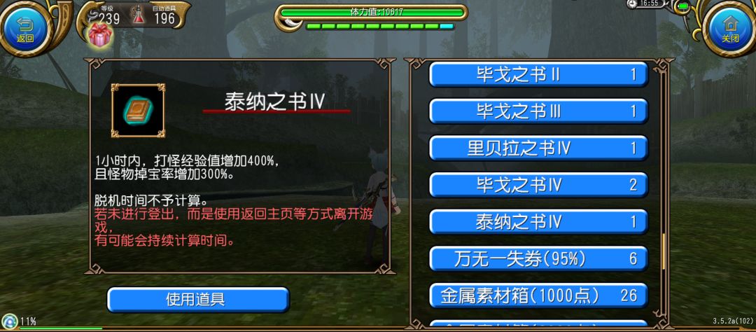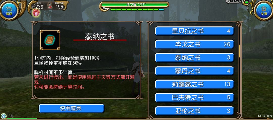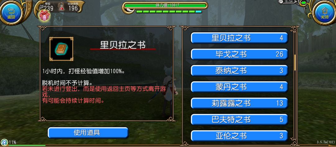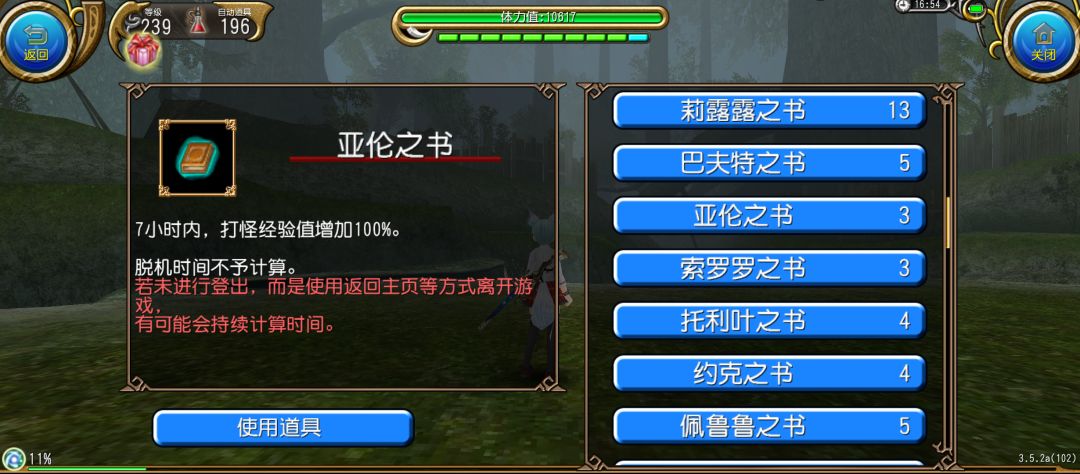 另外上述开书叠加最多能够使用5本,且同名的书籍不能够重复使用,切记合理规划,如果中间队伍解散,可以先下线规避书的损耗,这时游戏里的书的计时是暂停的,可以在工会群摇人以后再去升级