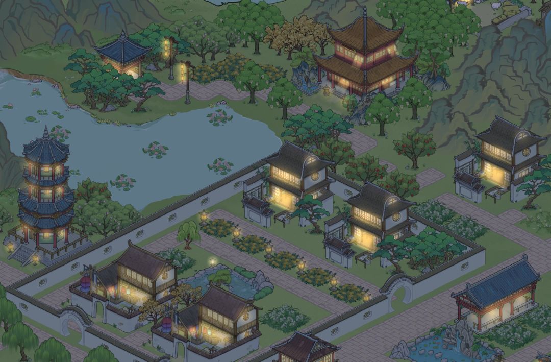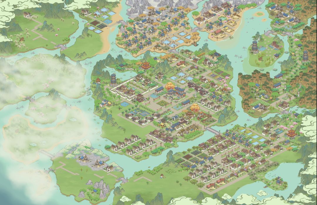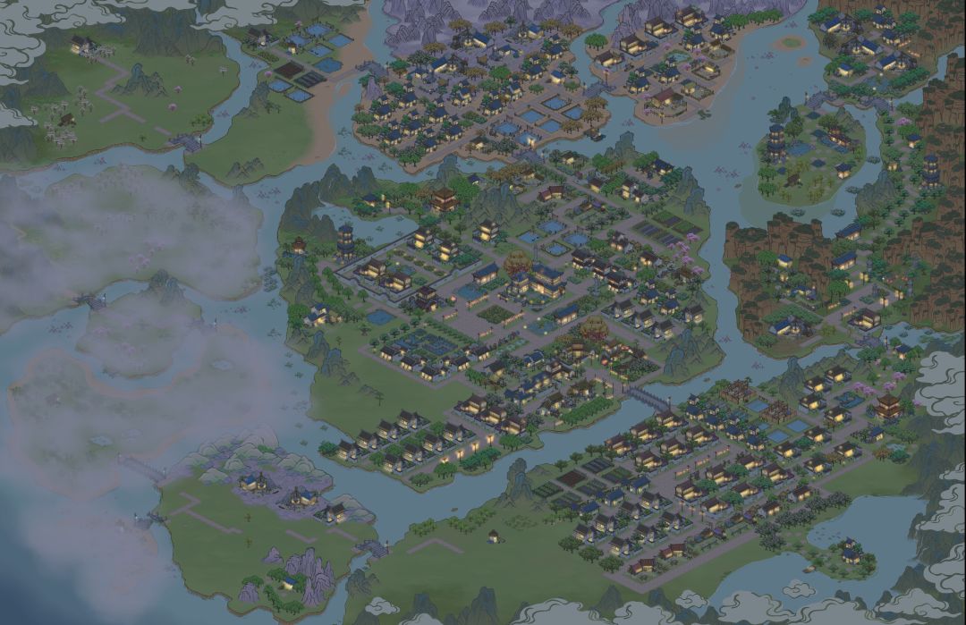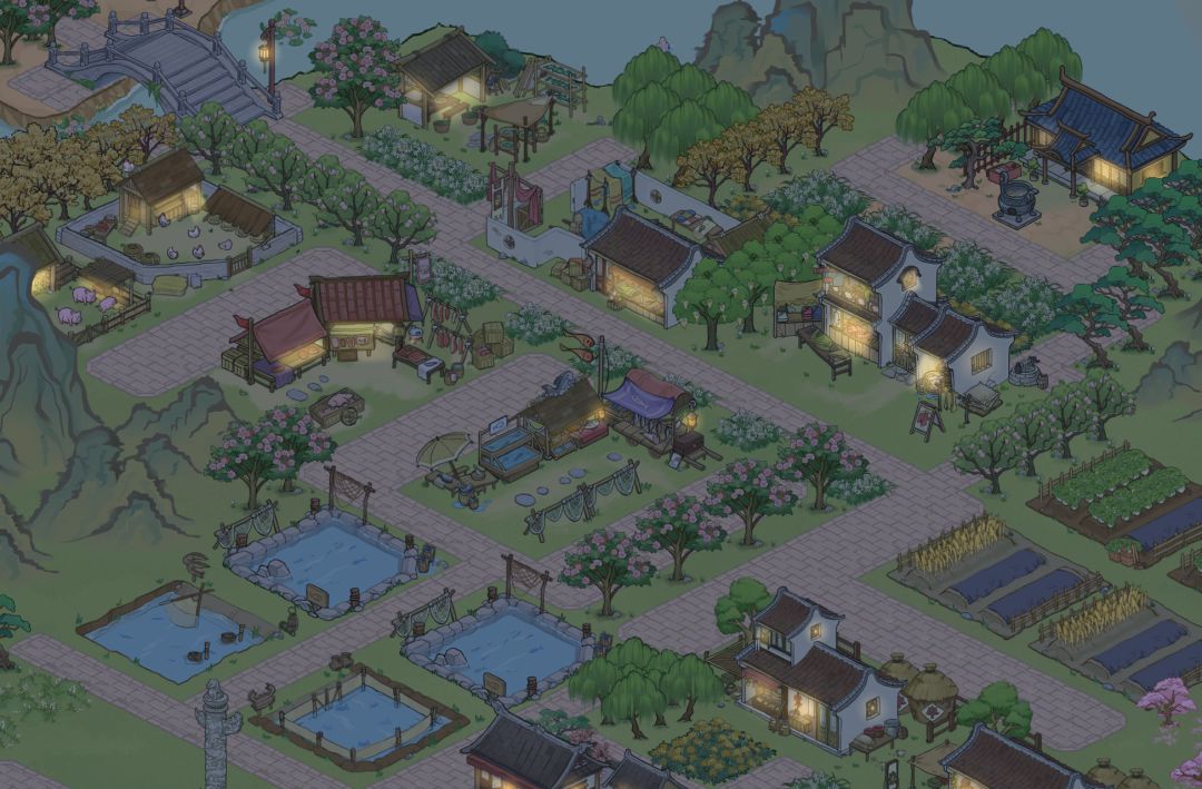 【综合市场】原生的山很多都没有破坏,喜欢这种刚好以山为界,把城市划分为不同板块的感觉。所以官府后,山脚下,养着鸡猪羊,还有虾塘鱼塘。本着靠山吃山,靠水吃水的原则,第一个肉摊、鱼摊,也坐落在这里。街的另一边,是产业链从养蚕场到布坊再到裁缝铺,居民的吃穿都可以在这里解决。裁缝铺边上一条隐匿的小路通向不为人知的道观,观中居士潜心修炼。