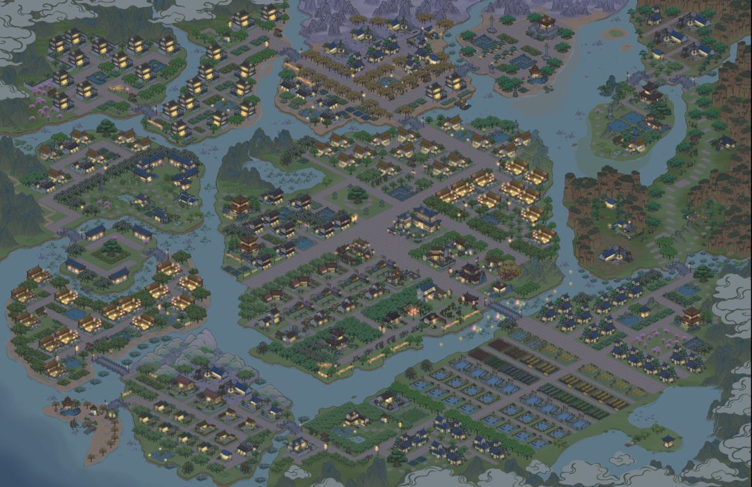 最开始开图的时候就决定在这张图上打造自己的农业中心,布局时本想把种植和养殖都放在一起的,但发现自己养殖太少了摆出来不够整齐,便改成了农田和鱼塘,摆好后一看满足感爆棚。以及医馆部分的灵感是来源于董奉的故事。