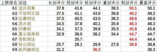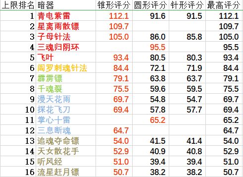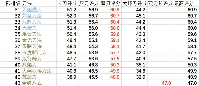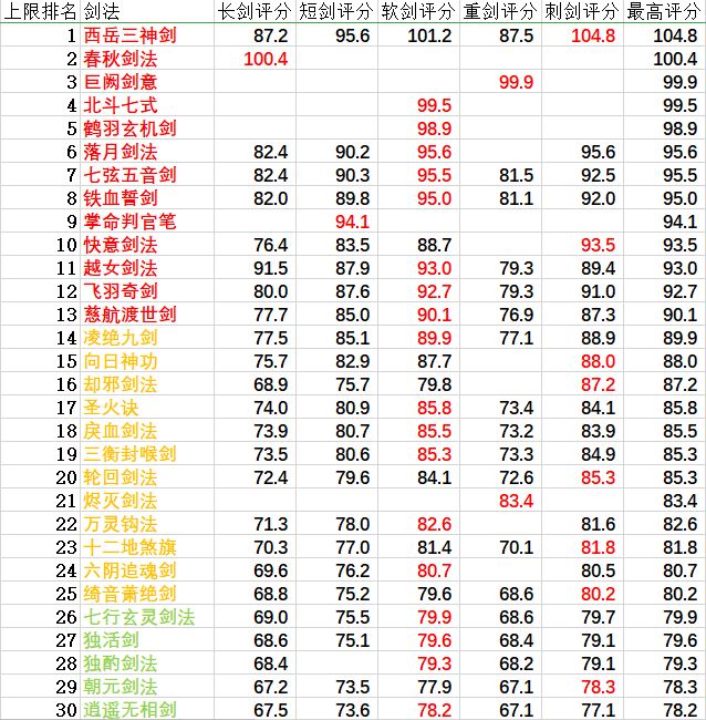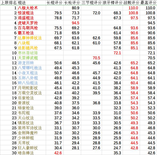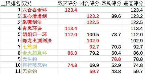 一、兵器武学所有可用神兵类型的平砍评分数据一览表