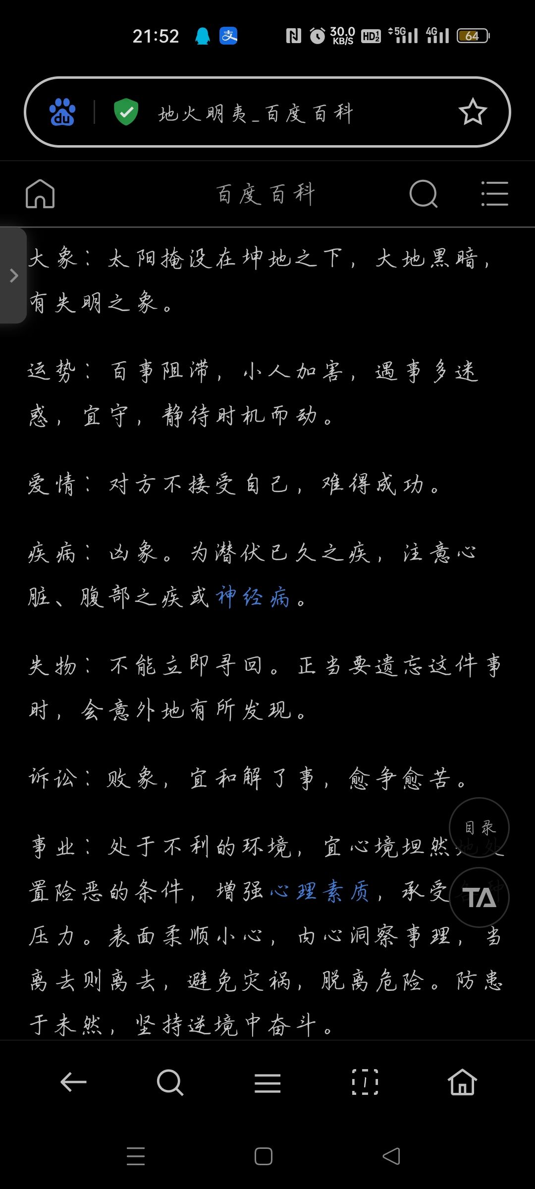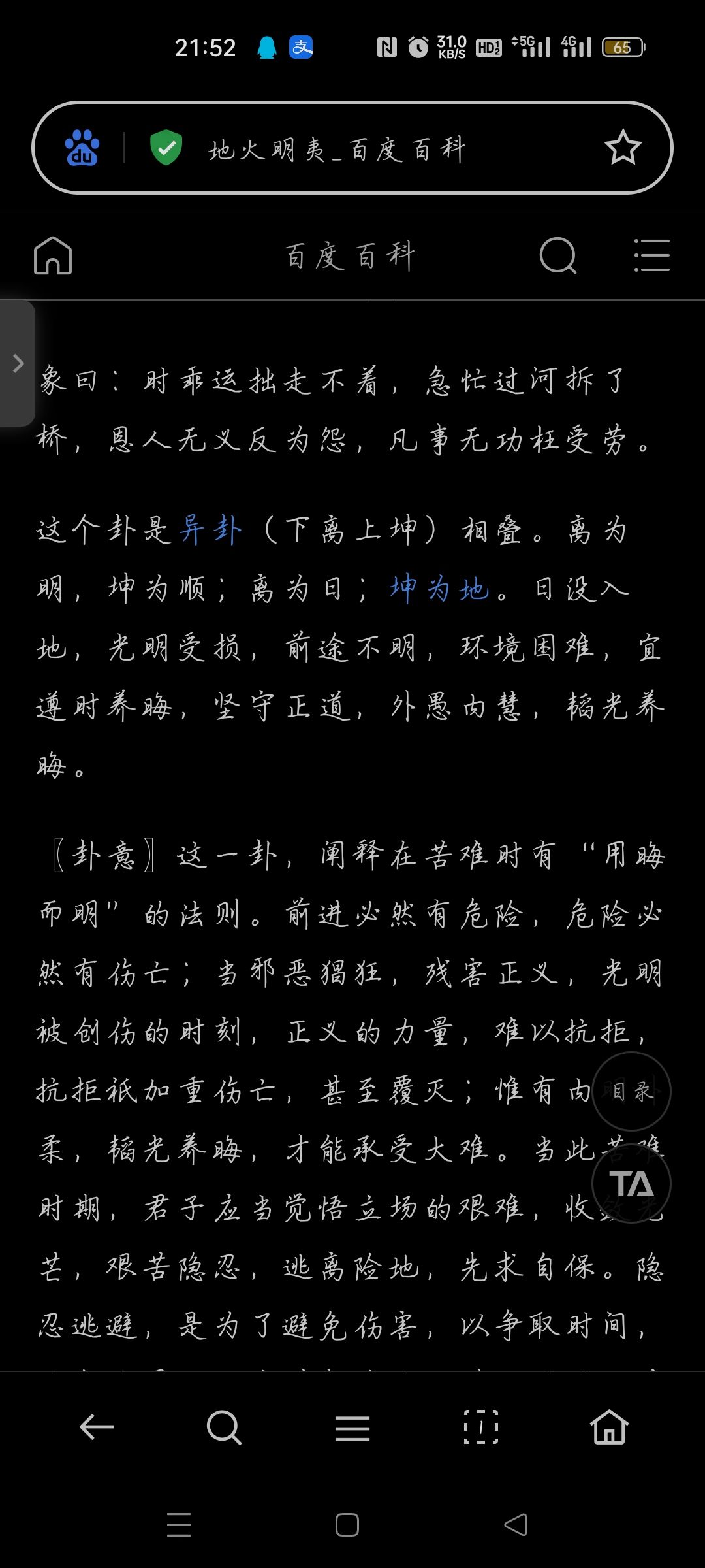 二来看分线里的卦象——坤上离下,地火明夷,进必有所伤。根据度娘的解释p1-4来看,应当是个敌暗我明,敌进我退的释义。