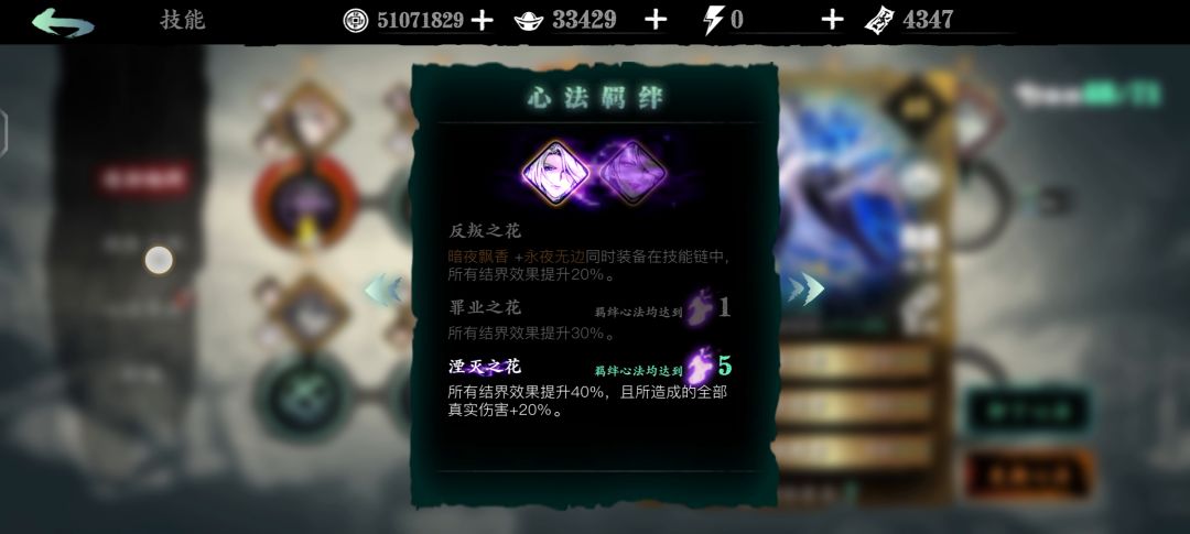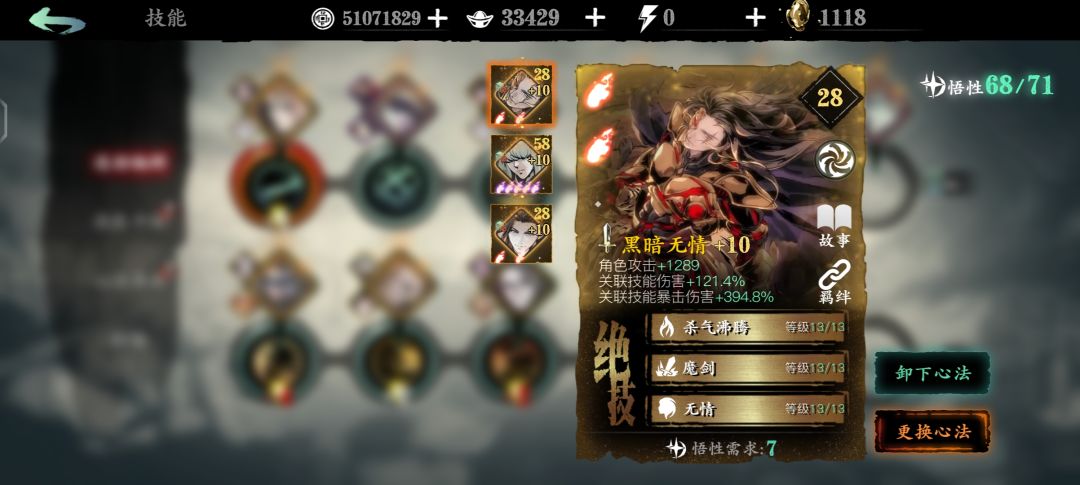 永夜(提供额外杀意,提供间歇性沉默效果,契合武痴增伤,心法属性包含奥义加成暴伤提升);