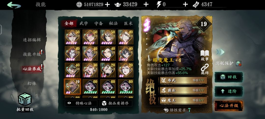 点击对应心法分解可分解单个心法,也可点击左下角批量分解,可手动选定也可一键选择蓝白心法,注意分解展鹏养幻体。紫卡成型后可分解紫卡获取蓝豆兑换白剑白奶。
