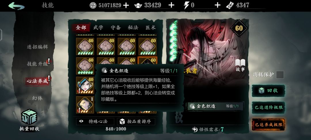 心法按品质分为白、蓝、紫、普通橙、稀有橙;按用途分为可装备心法、特殊心法。蓝白卡和经验宝宝都是狗粮,可以升级心法,也可以分解获得心法进阶材料。普通橙是抽到后不带回收保护的卡,稀有橙是抽到后自带回收保护的卡,无论是普通橙还是稀有橙,都不推荐胡乱分解,尤其是稀有橙一定要留着,普通橙可以在急需凑黄豆时分解一部分废卡。穿梭之人:建议给四黄火的橙卡用。沉思之人:很稀有的卡,可以在升华时代替任何黄火卡,必须只能用在稀有橙的升华中。绝技宝宝:随机给一个未满级的绝技升一级。织衣者有两个用途:1、给华服升级,2、可装备心法每吃一个织衣,都会随机给一个绝技+1等级上限,每个绝技最高提升2级等级上限,当每个绝技都提升2级之后,这张卡就会自动变为珍藏,省流:紫二以上的卡吃六张织衣必定升珍藏。PS:绝技全满级时绝技宝宝和织衣者不要同时吃,只有织衣者会生效。