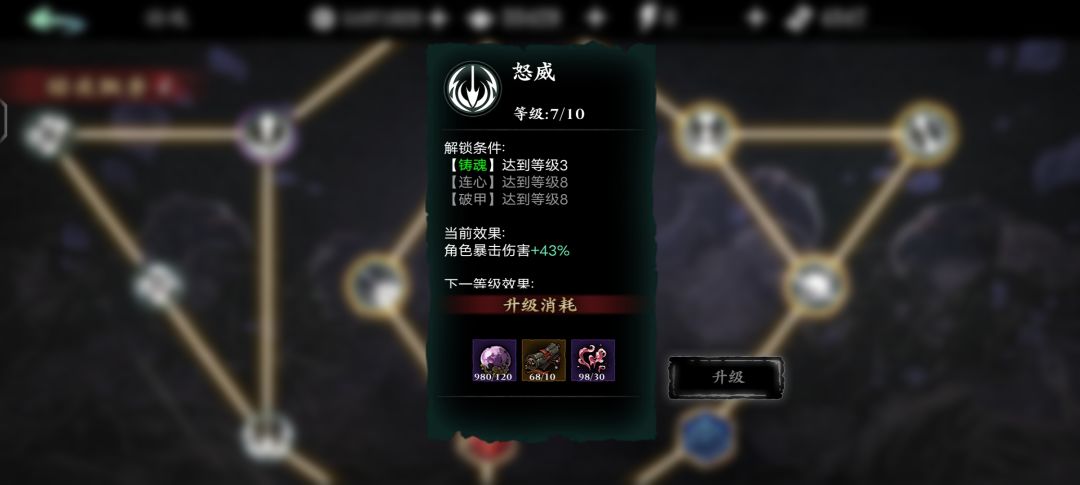 消耗一定材料给心法进阶,阶数为心法名后的“+?”。升+5和+10时需要特定的材料,可以点击材料图标查看获取途径,有些材料获取一次后就会绝版,有些材料压根获取不了,可在京城十字路口的聚宝商店购买,聚宝商店每天会随机刷新部分材料,所以没刷到想买的材料时请稍安勿躁,等第二天的刷新。心法进阶推荐优先进阶带暴伤属性的卡,其次是武学卡,再次是秘法卡,吃防御加成的职业,守备大于医学,不吃的无所谓。