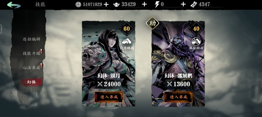 现版本只有银月和展鹏两个幻体,幻体升级的材料通过分解对应的心法获取或者在帮会商店中兑换,只推荐分解展鹏养幻体,新手可以无脑升满展鹏带展鹏,先不用管银月,之后银月碎片从帮会商店兑换,每天可以把奉捐拉满换一抽然后换银月碎片。幻体不需要提升绝技。展鹏的攻击提升对新手很重要,很重要!
