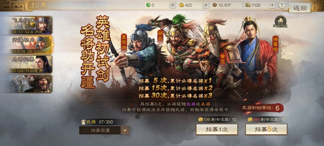 前两周我们总共能获得上万金铢,配合名将招募卡池的免费及半价抽卡机会,加上一些活动任务送的招募券,我们两周大概能获得120抽。