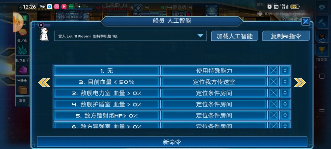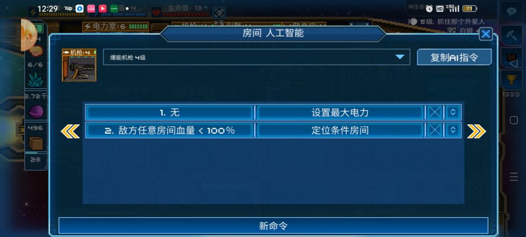 飞船升到四级后解锁指挥中心,建造完指挥中心你会发现船员和武器多一个选项——AI控制,继续升级指挥中心还能获得两块芯片,修复者和破坏者芯片,注意哦它们是没有金刚不坏神功只能使用三次的限制的