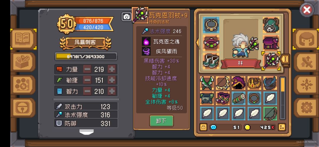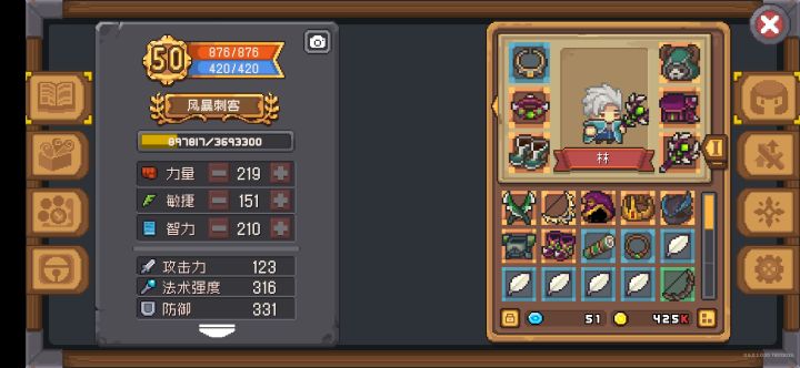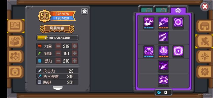 关于装备,建议不要卖给商店,刷一下副本得的钱都比那多。要用的就留下,不用的就分解。(可以给猫猫戴戒指和项链,不受等级限制)装备等级最高有九级,前三级成功率100,四到六次80,七到九次60,装备升级需要很多金币(真的很多),但是可以+基础属性,我现在用的法杖没有等级时法强127,满级246,法强关乎我的伤害,我的法强大部分都是武器提供的。