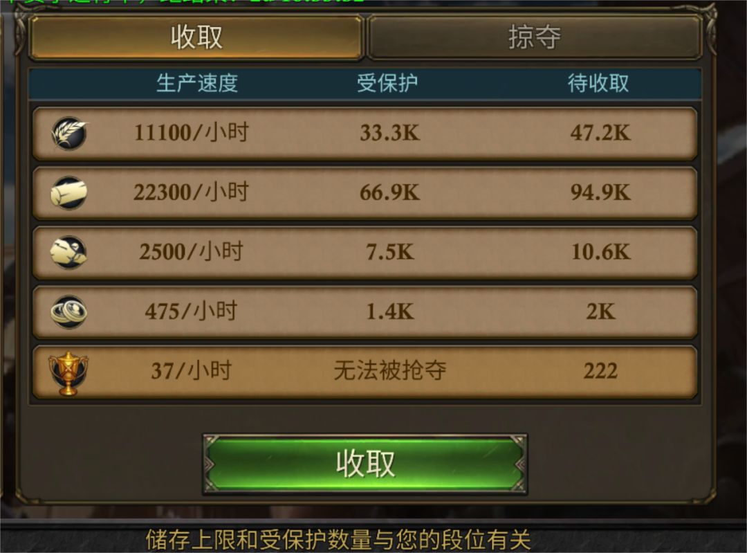 荣耀锦标赛【收取】每隔六个小时会产出四种基本资源和天梯奖杯,到达上限后不会再继续产出,且被其他领主挑战失败后会被掠夺一部分走,但是可以通过复仇夺回资源。同时资源有受保护数量,与段位高低成正比。