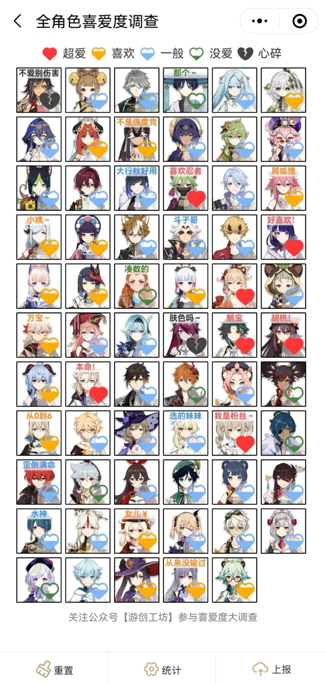 入口(推荐不迷路):关注公众号:游创工坊→原神工具→角色喜爱度