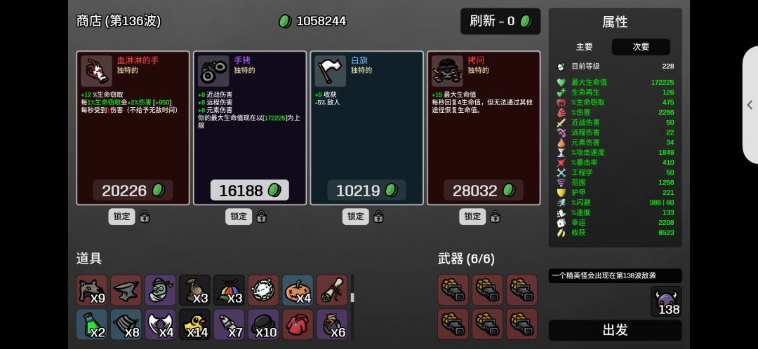 3、26波开始转土豆发射器,后面商店只卖眼球(适量)、花园、狩猎战利品、护垫、水熊虫、义警戒指,boss关靠拿消耗品触发的爆炸打伤害。
