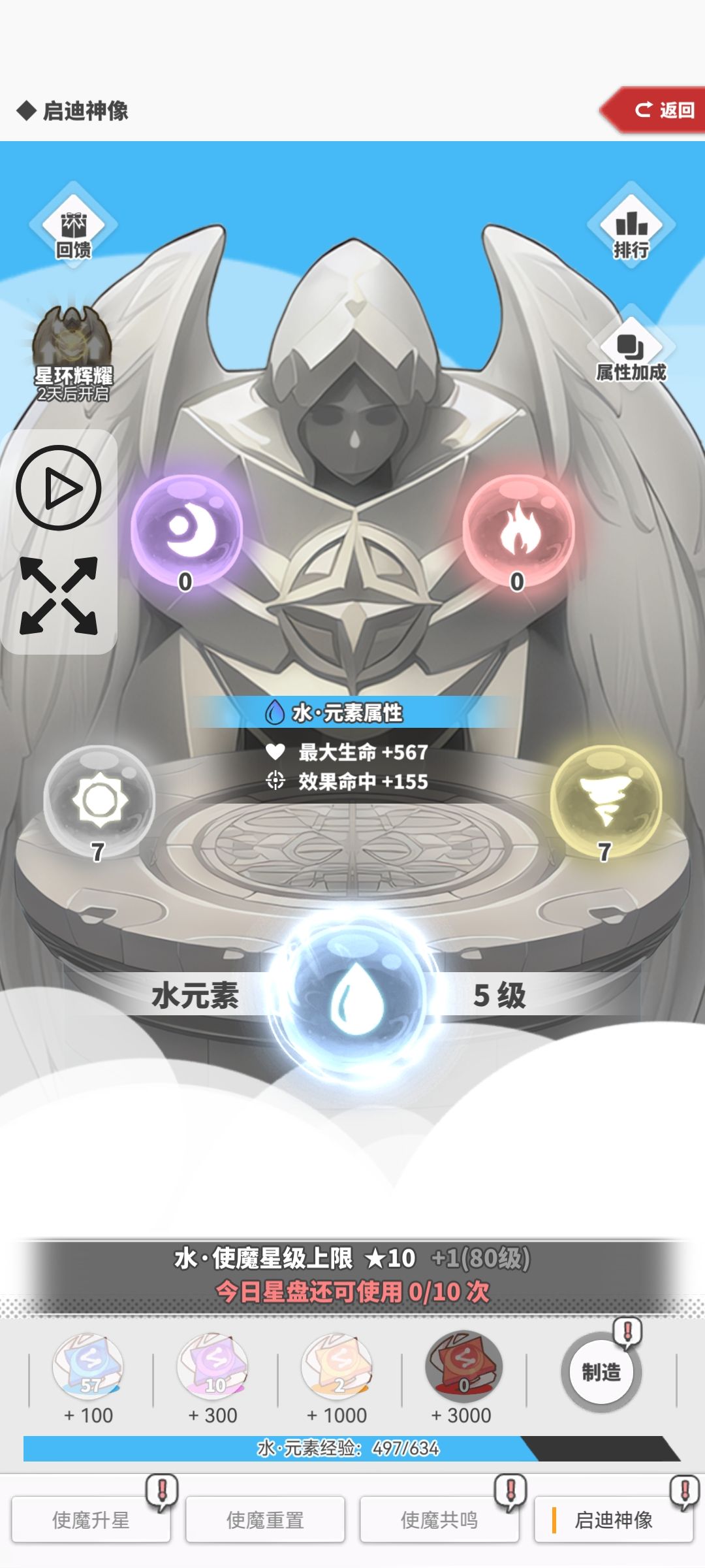 还有这个启迪神像有一个活动,记住高级的星盘等到活动开启后再使用。这样收益才能最大化。每天的10次可以用蓝色星盘点。记住不要浪费每天的次数。因为材料目前来说是有空余的。
