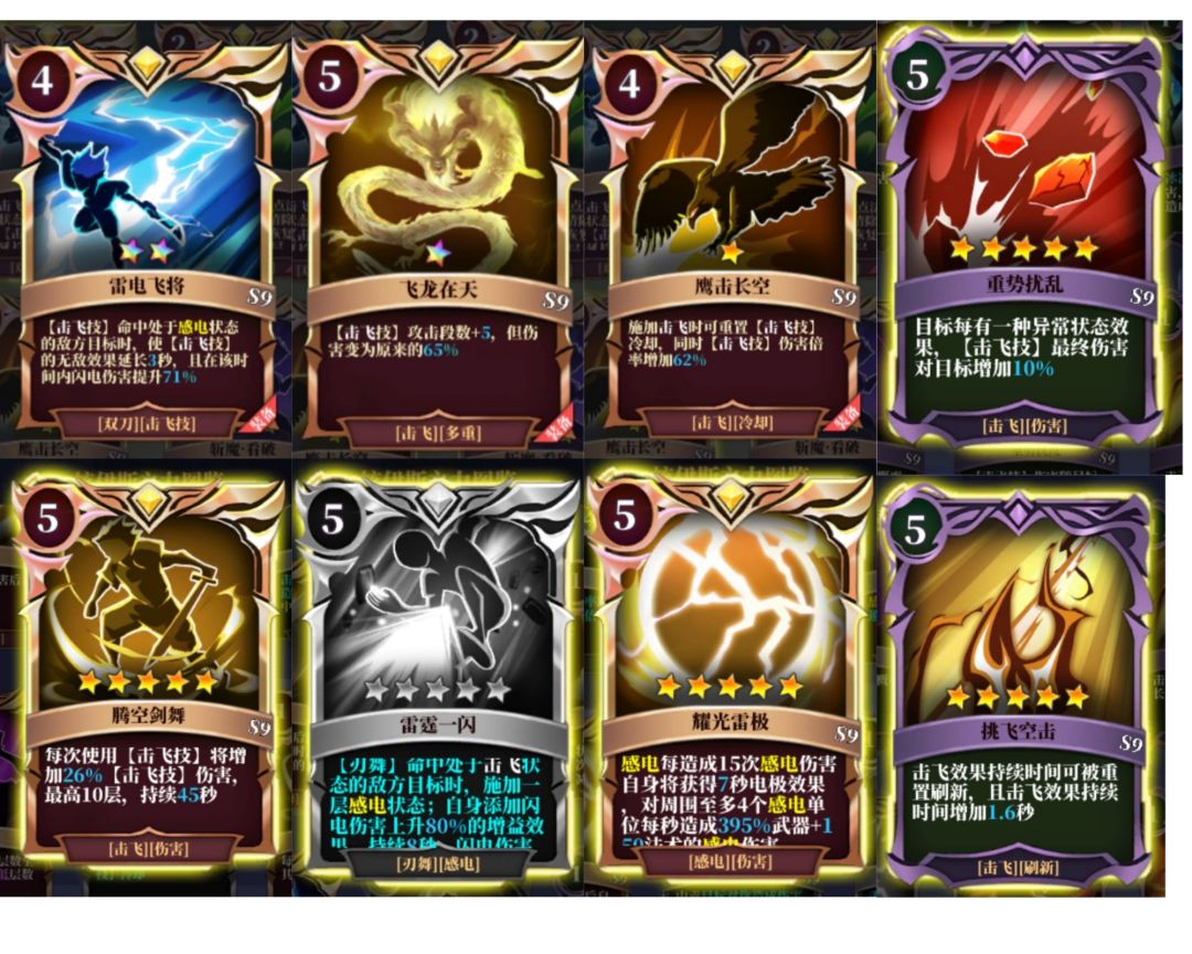 同时有挑飞空击这张紫卡的存在可以延长击飞状态的持续时间,当有了2级击飞扩散的时候加上自身雷霆震击刷新击飞技冷却基本可以做到无限使用击飞技!