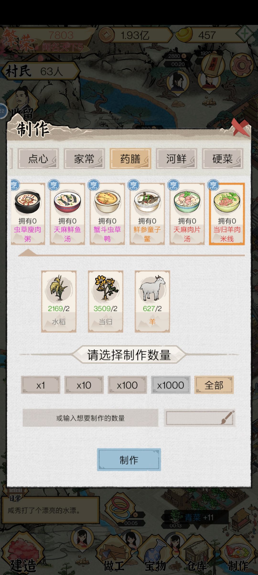 第一天晚上交易的食材刷出高价格的当归羊肉米线、百合牛肉卷、辣子鸡中的一种(主要多种食材而且数量一致),升级好加工设施,开着手机过夜💤。第二天一早就会发现买完菜后铜钱爆棚,一下全部升满了。