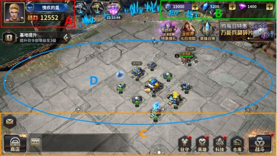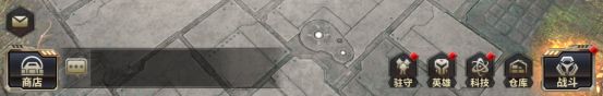该区域主要集中了游戏的各种功能系统入口,包括战斗、仓库、英雄、科研、邮件、商店、聊天功能等,指挥官可以由此进入具体功能的操作页面,来管理、建设发展基地,提升自身实力。