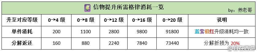 信物培养涉及到由前期到后期的信物更换和升级,在这个过程中很多玩家都没意识到,分解信物实际上是有格律亏损的,也没有了解清楚给阵容中各个神将升级的顺序?具体到多少级?实际去培养并不复杂,说到底就是一个格律资源的分配问题,所以先来看一个数据消耗表。