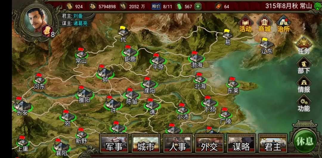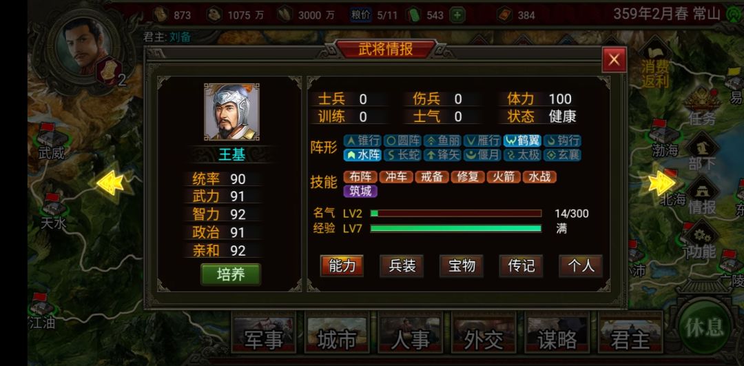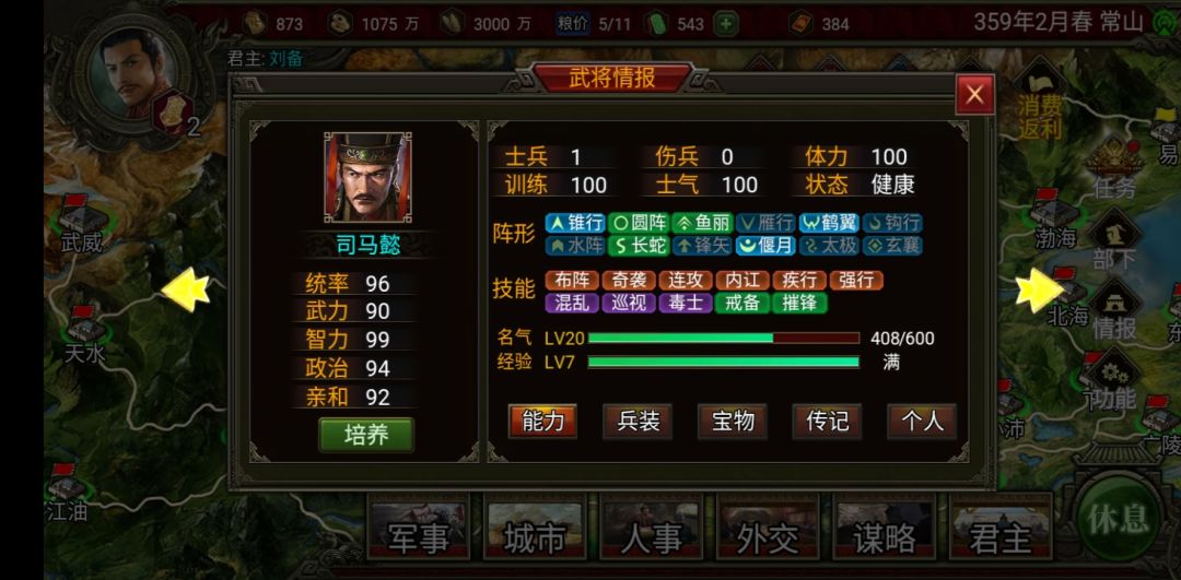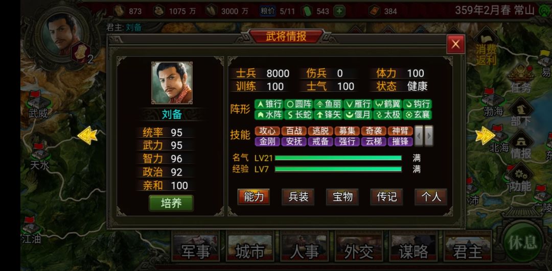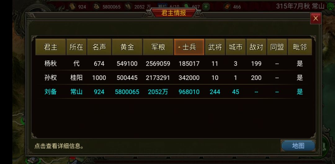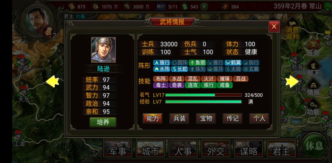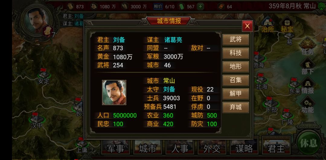 当然如果你还剩两个势力你可以把另一个赶到渤海,然后你和这个势力结盟,这样曹操势力(建议把曹操和曹丕都砍了,只要君主智力高就砍了,我的被我砍成杨秋了)就只能打你的常山了(就不用管它打你的渤海你还得刷档,反正那两个势力一定会同盟的)