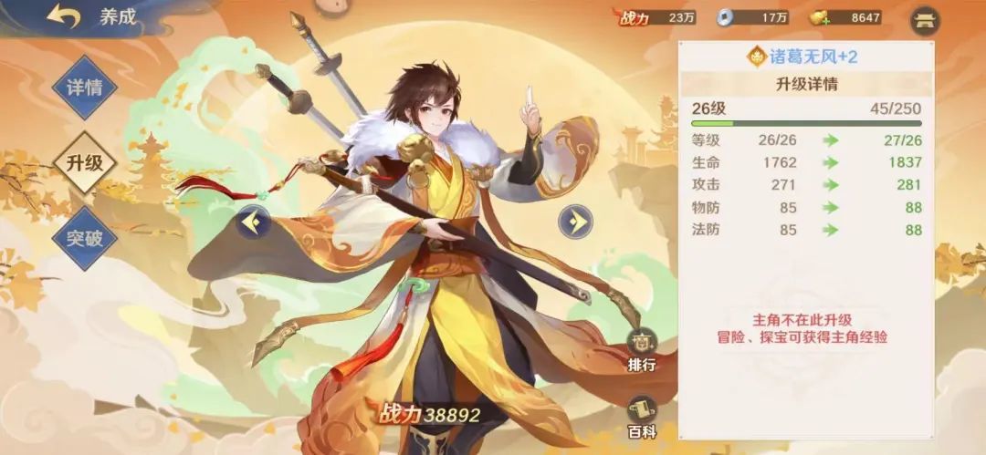 2.主角和其他神将的升级还是有一定区别的,主角升星需要用到仙阶,该道具的获取方式还是比较多的,比如商店购买、拍卖行、门派问答(这个是需要加入门派的)3.角色进阶:一般来说神将的等级是根据主角的等级来决定上限的,角色进阶后可以带来基础性属性的加成外,还能解锁自身所携带的新的被动技能,部分角色在解锁被动技能后会有质的飞跃。角色的进阶需要用到相同的角色(这个需要我们去抽取)因此零氪玩家的话还是建议大家优先培养版本强势的橙色神将,红色物品可以着重培养一个。