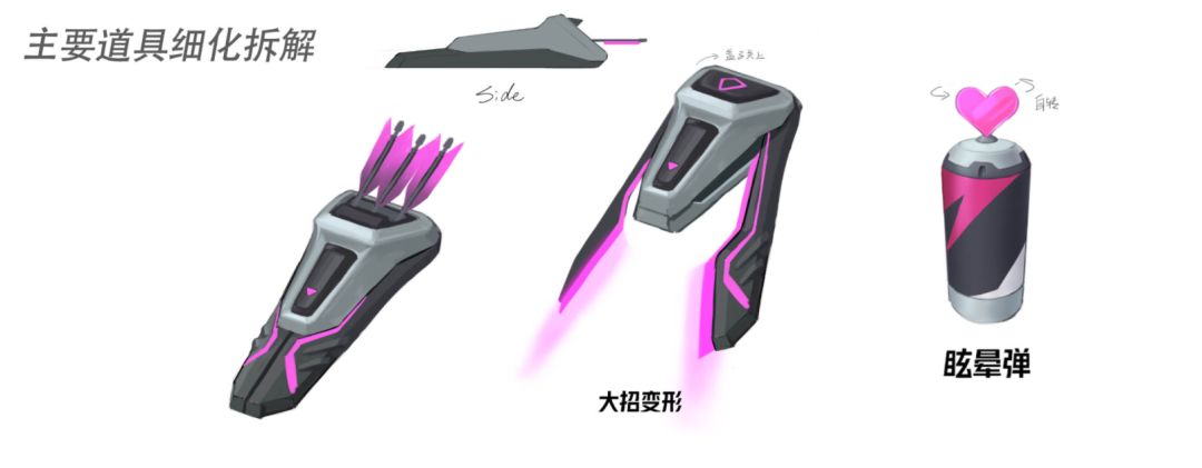 比较有趣的是,一开始的花翎是作为一个混合型中近战英雄设计的,主要利用身法和科技装备与敌人拉扯周旋,再接近敌人斩杀。想法好归好,但近战弓兵总有一点点奇怪,加之操作会变得相当复杂,所以我们去除了大部分花里胡哨的机制,但保留了混合型的设计思路,让花翎回归远程狙击的本职工作,同时也能为团队提供一部分功能性。