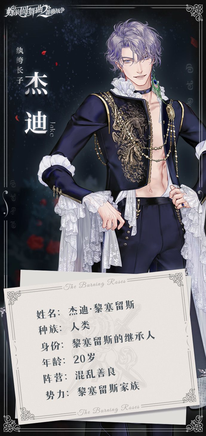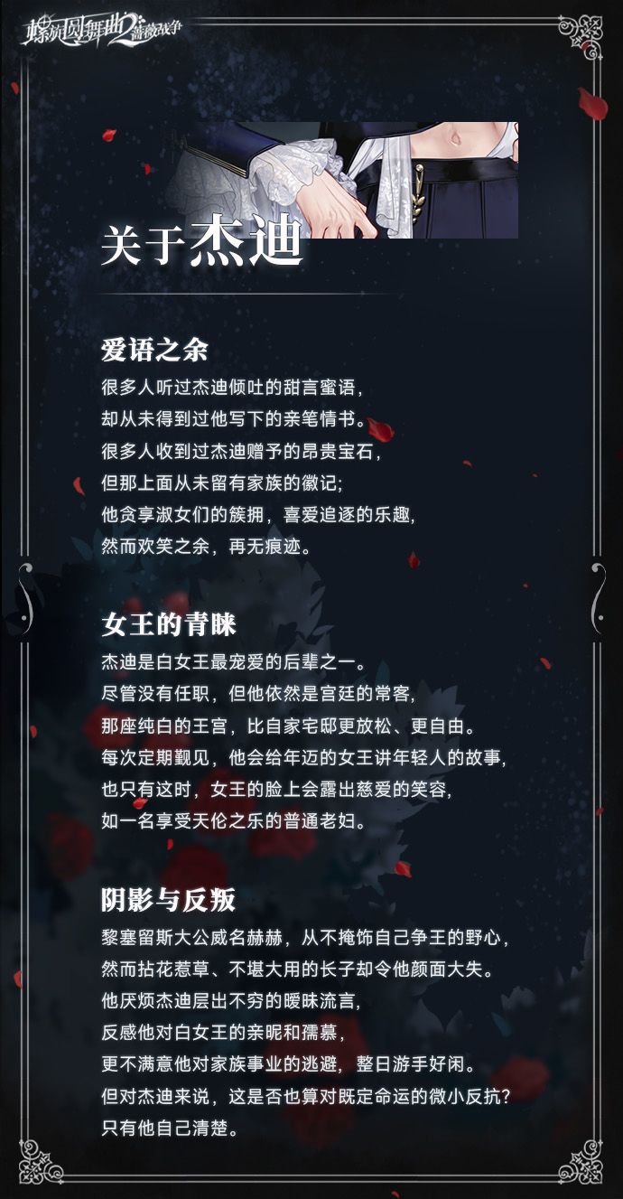 杰迪礼节性地追逐每一位进入社交界的淑女,信手拈来的花言巧语和奉承恭维,能让最矜持的女士晕晕乎乎地同意和他一起喝下午茶。不少刚来到蔷薇首都的交际花会把他当做往上爬的绳索,拼命地攀附,这位慷慨阔绰的年轻绅士乐于挥霍自己的情意,和淑女们各取所需。