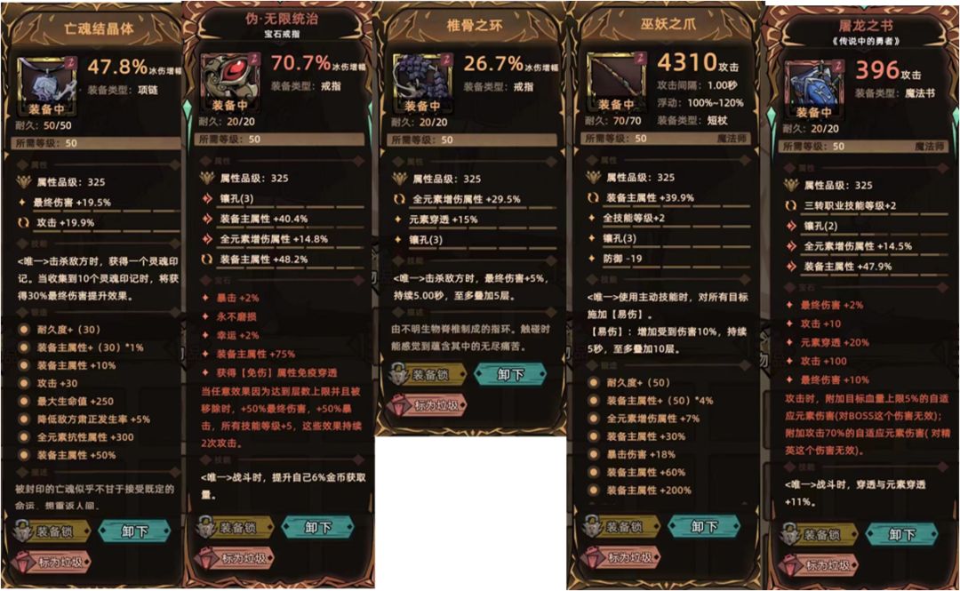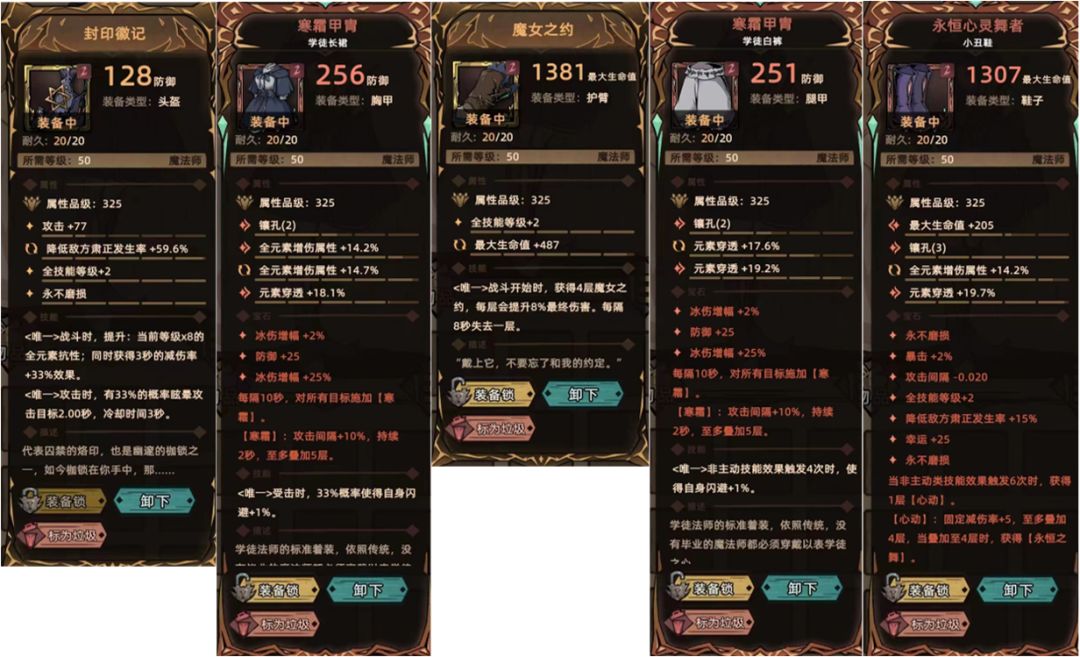 这里给出我推荐的一套装备组合,核心思路是100%元素穿透、90+肃正、全技能等级+10,然后堆高攻击、冰伤、元素增伤、终伤即可。