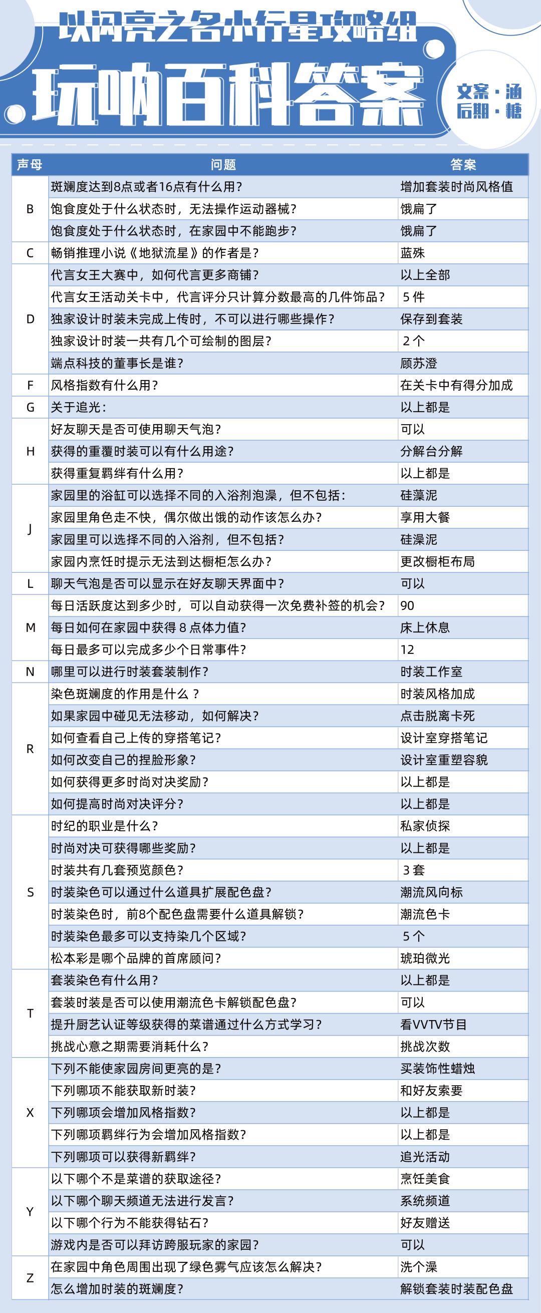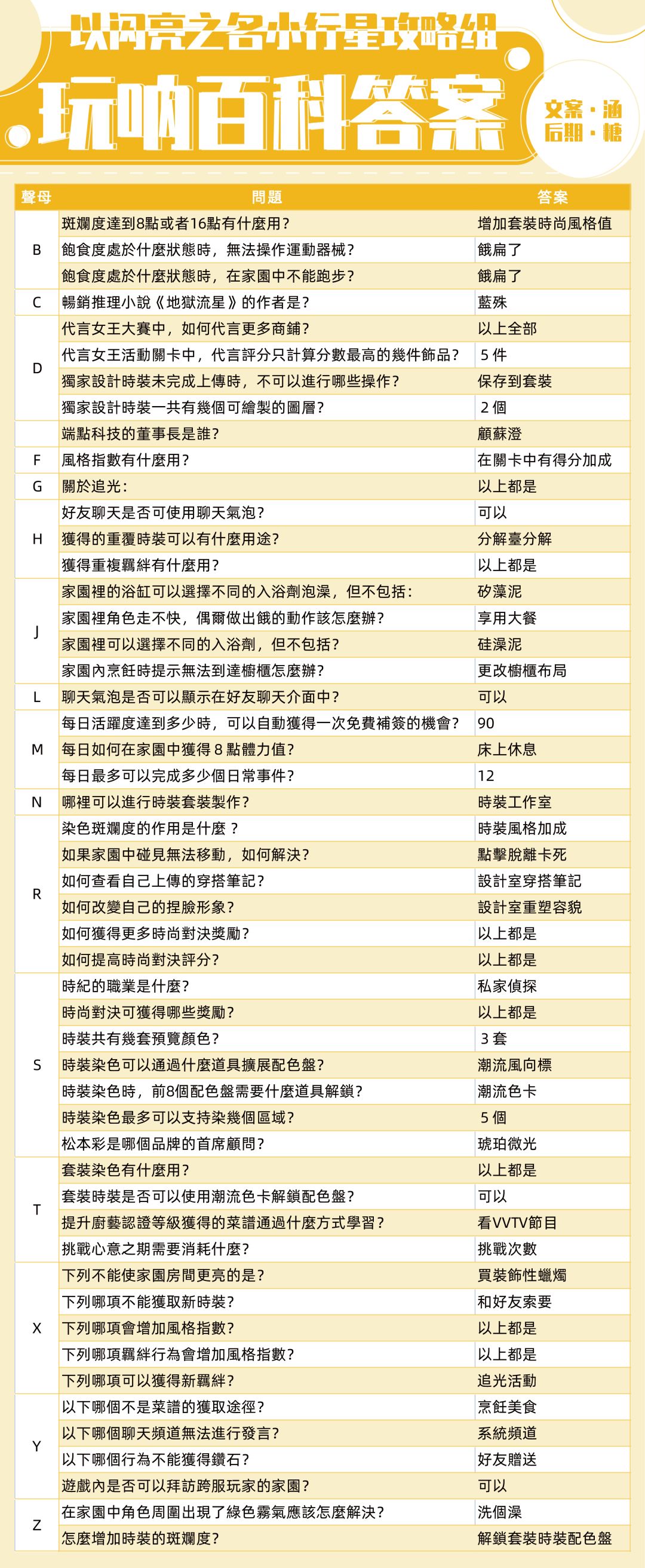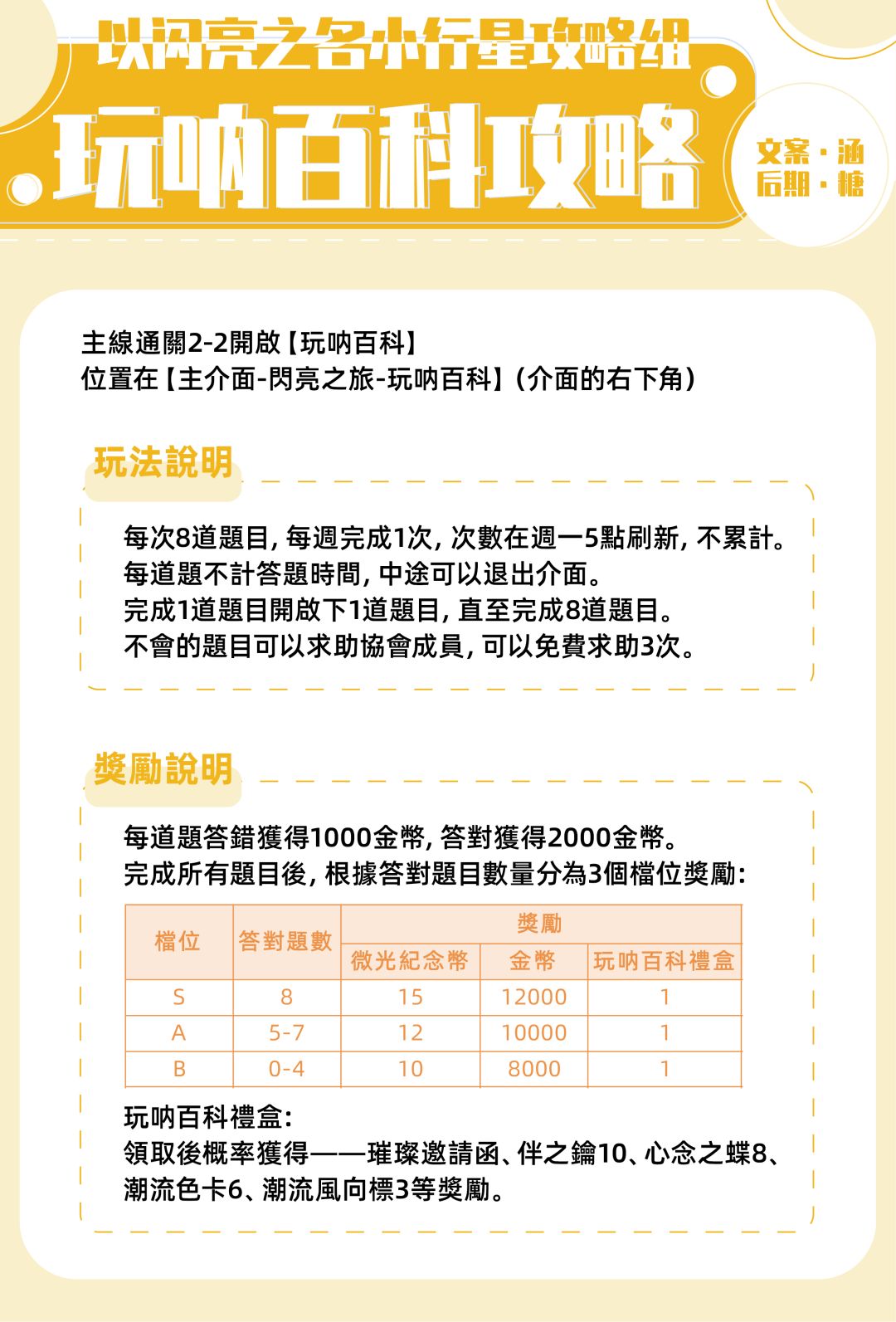 我们是【非官方】以闪亮之名小行星攻略组,主线通关2-2开启【玩呐百科】,位置在【主界面-闪亮之旅-玩呐百科】。小行星准备了玩呐百科攻略,包括玩法说明、奖励说明以及百科答案,根据答对数量分为三个档位奖励,各位合伙人注意及时查收建议点击原图查看。