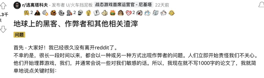 比如制作人尼基塔在不久后发帖宣称开挂的人是人渣、垃圾。