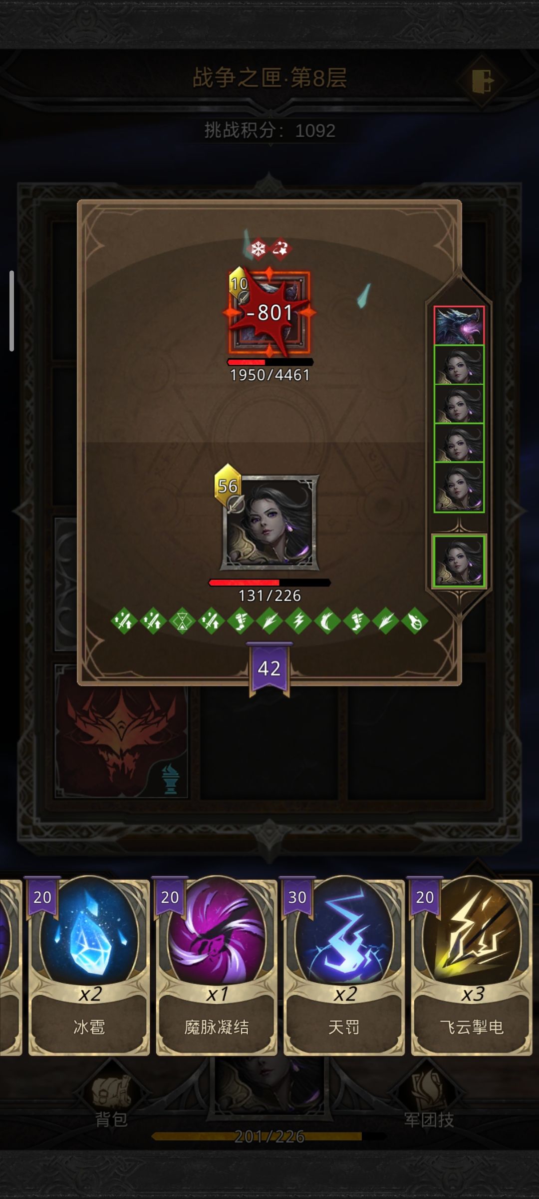 然后需要注意的一点就是前面遇到重拳别用。都留着。第八关boss攒100士气。先用加魔伤卡。然后眩晕然后天雷两发直接小半血。再加上普攻伤害。轻轻松松。