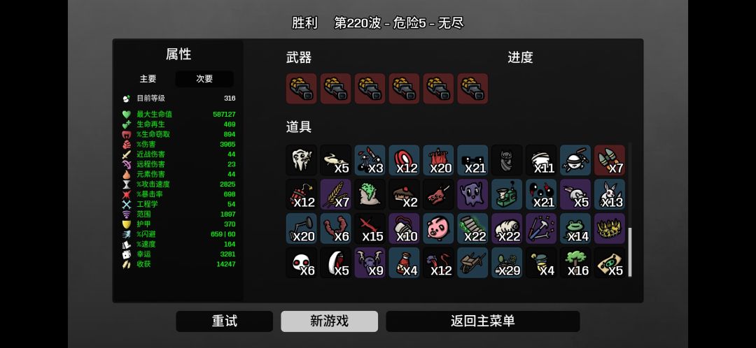 2、在12波前sl出这几个道具(改进工具以及3-4个辣酱),这段时间买加爆炸范围、血量、爆炸伤害的道具,以及生存的闪避、物品回复增加等。