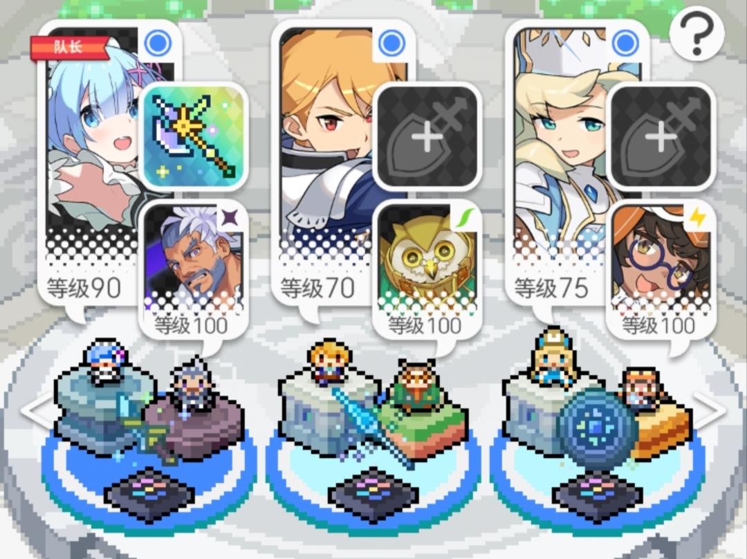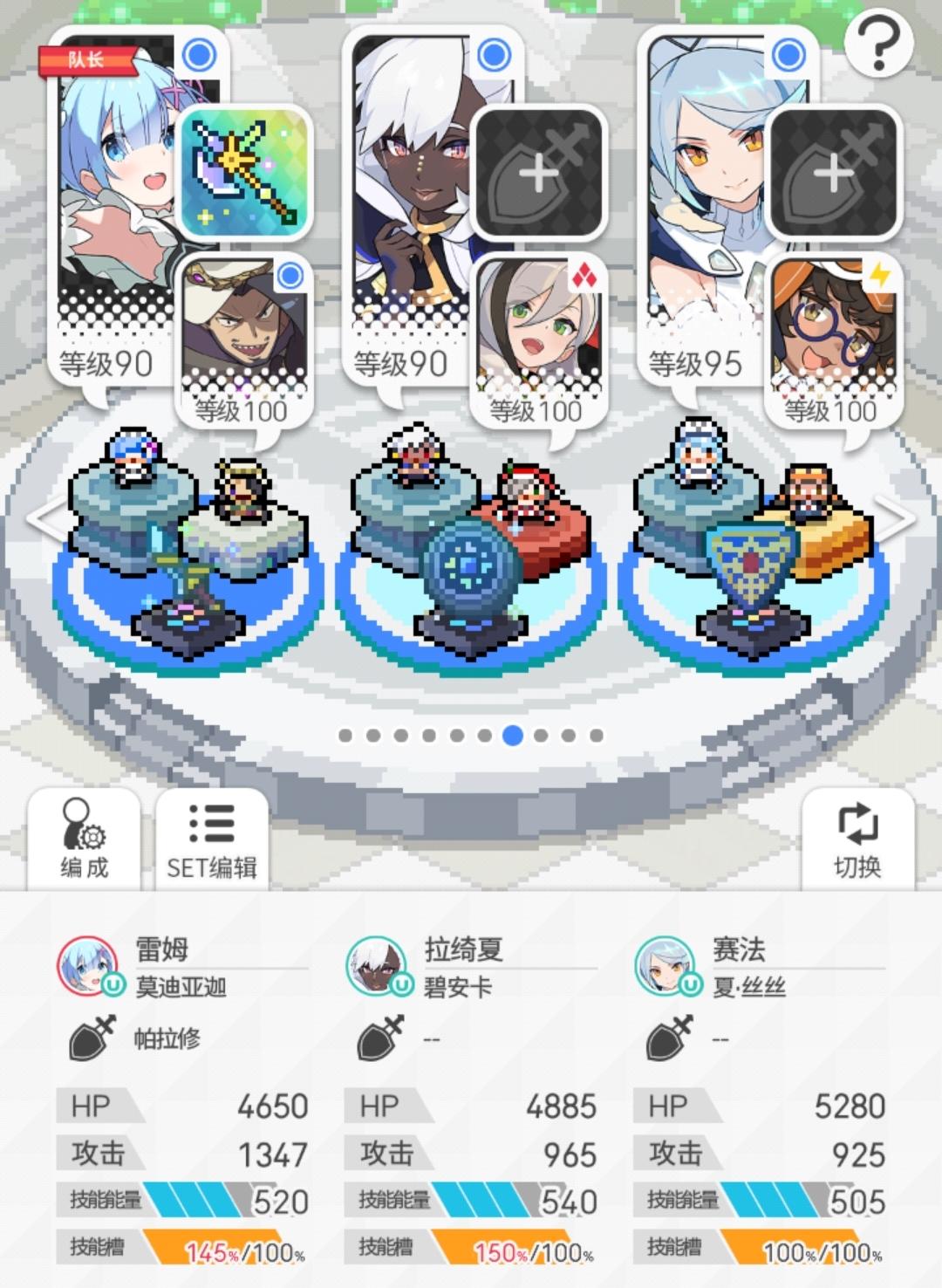 可以参考如上图,这里以水队为例,一般main位为纯色,三个属性相同,1号位为主c,一般大招(就是要滑动发动的技能)有高倍率伤害或高加成(sub位则需高倍率伤害),其他为辅助(给1号位c位加成,奶,驱散,给boss属性down)。sub位为三大萌新之友暗gay(c位加成),猫头鹰,技工(给1号位c位加成)。