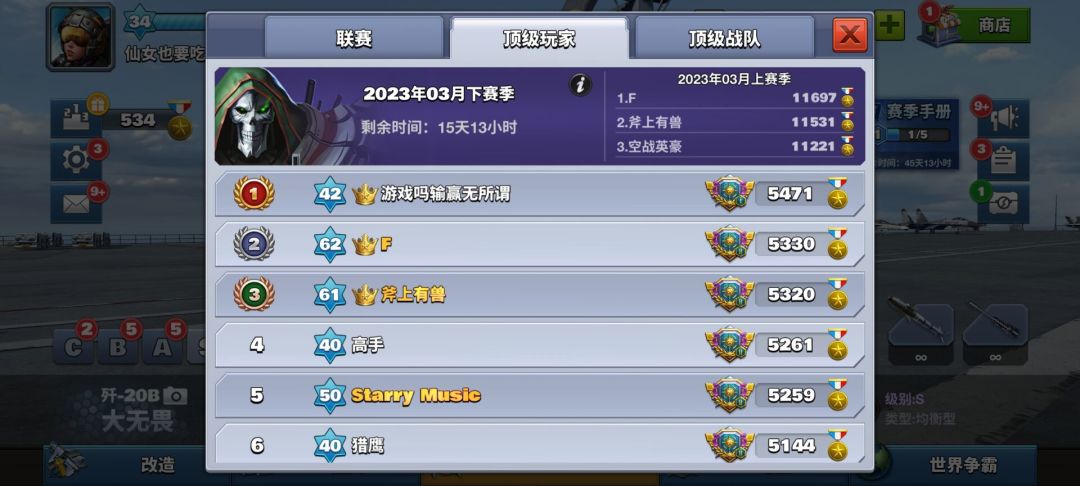 剩余倒计时的显示,那么多久算一个赛季呢?在《空战争锋》中,每个月设有2个赛季,每个赛季时间为15天,分别在月中与月初进行一次结算,每个新的赛季开始后,玩家的勋章将会被重置,高于4000分的玩家都会被重置到4000勋章。排行榜上还会显示上赛季勋章数排名前三的玩家。在保证每个赛季大家起点都相同的情况下,想冲分就完全凭借玩家自己的努力了,在这一点上小沃觉得还是设计的相当公平的。