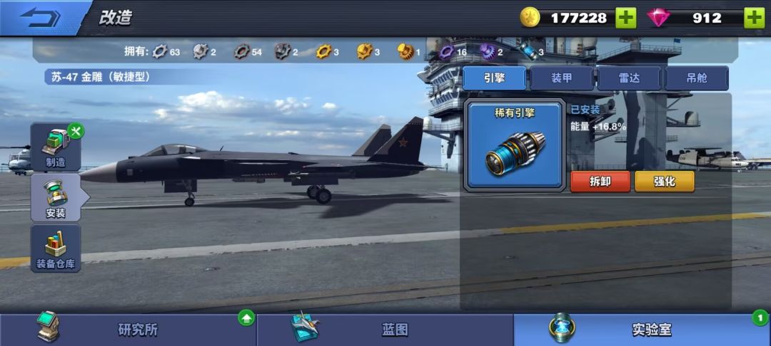 点击拆卸按钮,只需要花费一点金币,就可以无损拆下这件装备,然后在机库主界面选择想要更换的飞机,然后再进入改造实验室界面,此时再进行安装操作,即可更换装备。