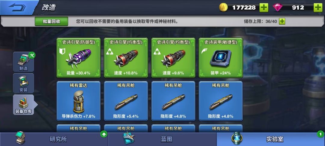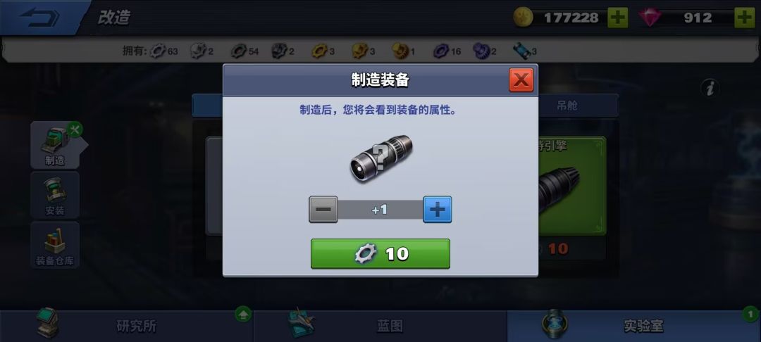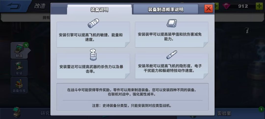 实验室模块8级解锁,我们可以在这里制造装备,给飞机配备不同类型的装备,提升飞机的实力。