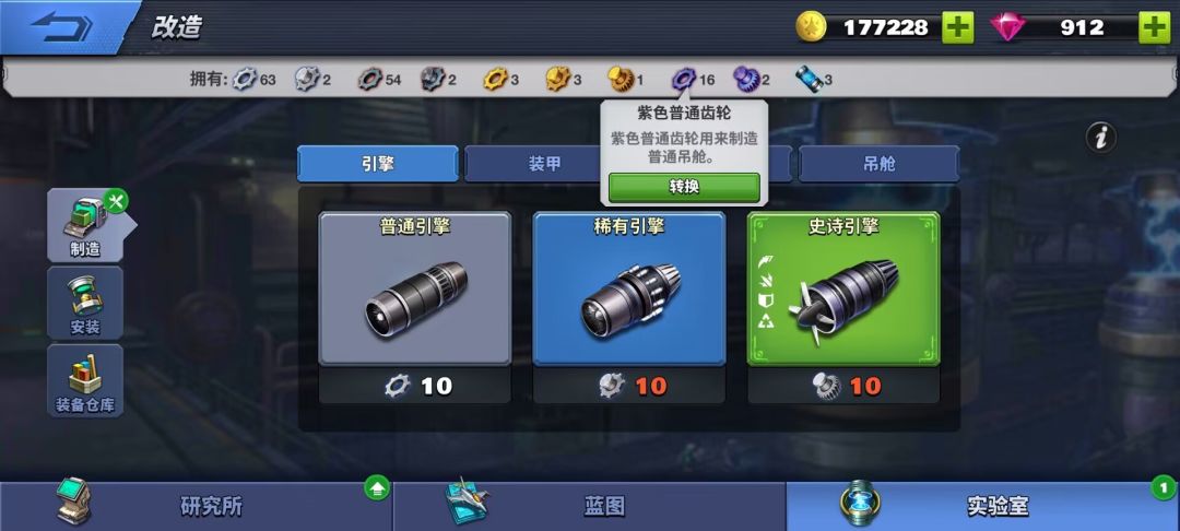 当普通齿轮个数超过10个时,我们点击普通齿轮,在弹出的气泡内会出现“转换”按钮。点击转换后,系统会自动把超过10个的普通齿轮按10:1全部转换成复合齿轮。按转换比例来说跟我们自己制造普通装备后出售获得的高级齿轮数是一样的,直接点”转换”相对来说更加便捷。
