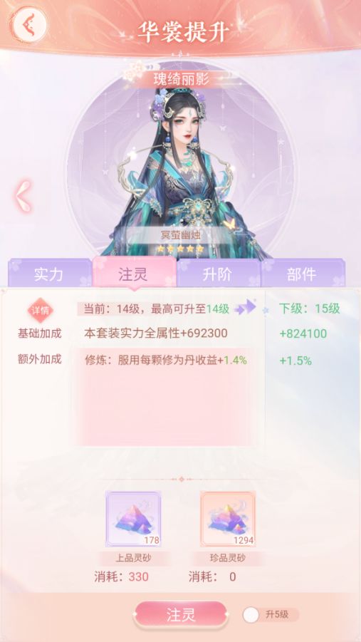 并且对套装的注灵以及升阶平均7阶为最佳,均值到了后再对套装进行后续的升阶(需要的灵砂最节省提升最大)