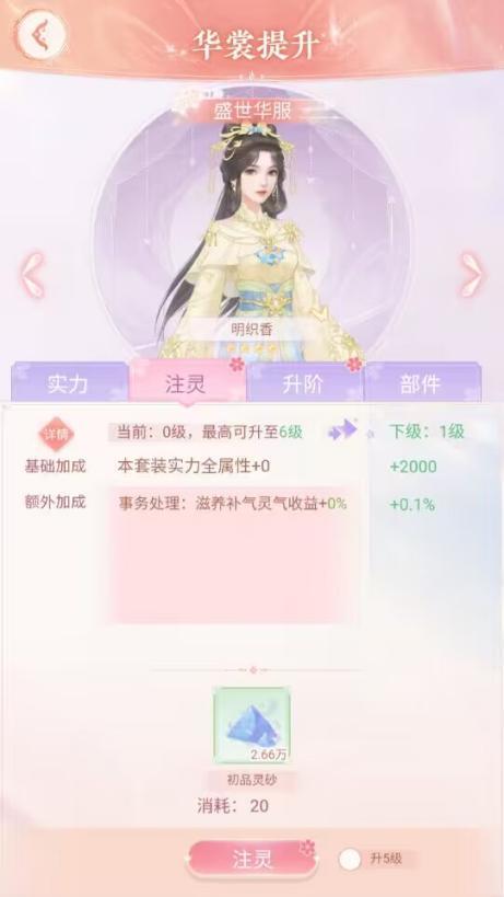 注灵:除了基础的实力加成之外,每升一级额外增加0.1%的滋补灵气收益,最高20级,加成2%