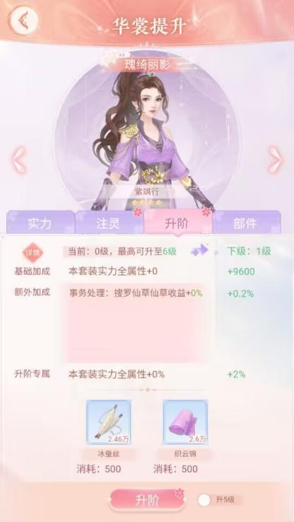 升阶:除了基础的实力加成之外,每升一级额外增加0.2%的搜罗仙草收益,最高10级,加成2%